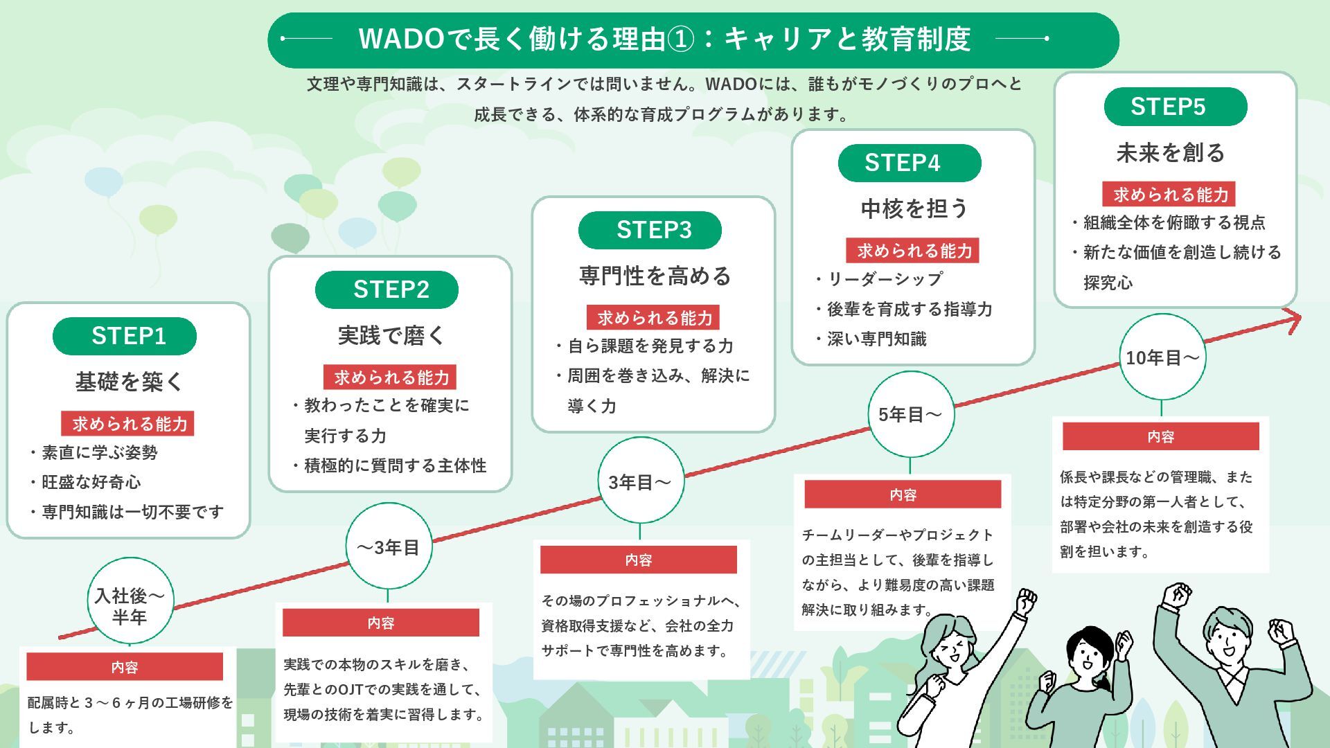 求められる能力 ・教わったことを確実に 実行する力 ・積極的に質問する主体性 STEP3 専門性を高める 求められる能力 ・自ら課題を発見する力 ・周囲を巻き込み、解決に 導く力 STEP4 中核を担う 求められる能力 ・リーダーシップ ・後輩を育成する指導力 ・深い専門知識 内容 配属時と3〜6ヶ月の工場研修を します。 入社後〜 半年 内容 実践での本物のスキルを磨き、 先輩とのOJTでの実践を通して、 現場の技術を着実に習得します。 〜3年目 内容 その場のプロフェッショナルへ、 資格取得支援など、会社の全力 サポートで専門性を高めます。 3年目〜 内容 チームリーダーやプロジェクト の主担当として、後輩を指導し ながら、より難易度の高い課題 解決に取り組みます。 5年目〜 内容 係長や課長などの管理職、また は特定分野の第一人者として、 部署や会社の未来を創造する役 割を担います。 10年目〜 STEP5 未来を創る 求められる能力 ・組織全体を俯瞰する視点 ・新たな価値を創造し続ける 探究心 WADOで長く働ける理由①:キャリアと教育制度