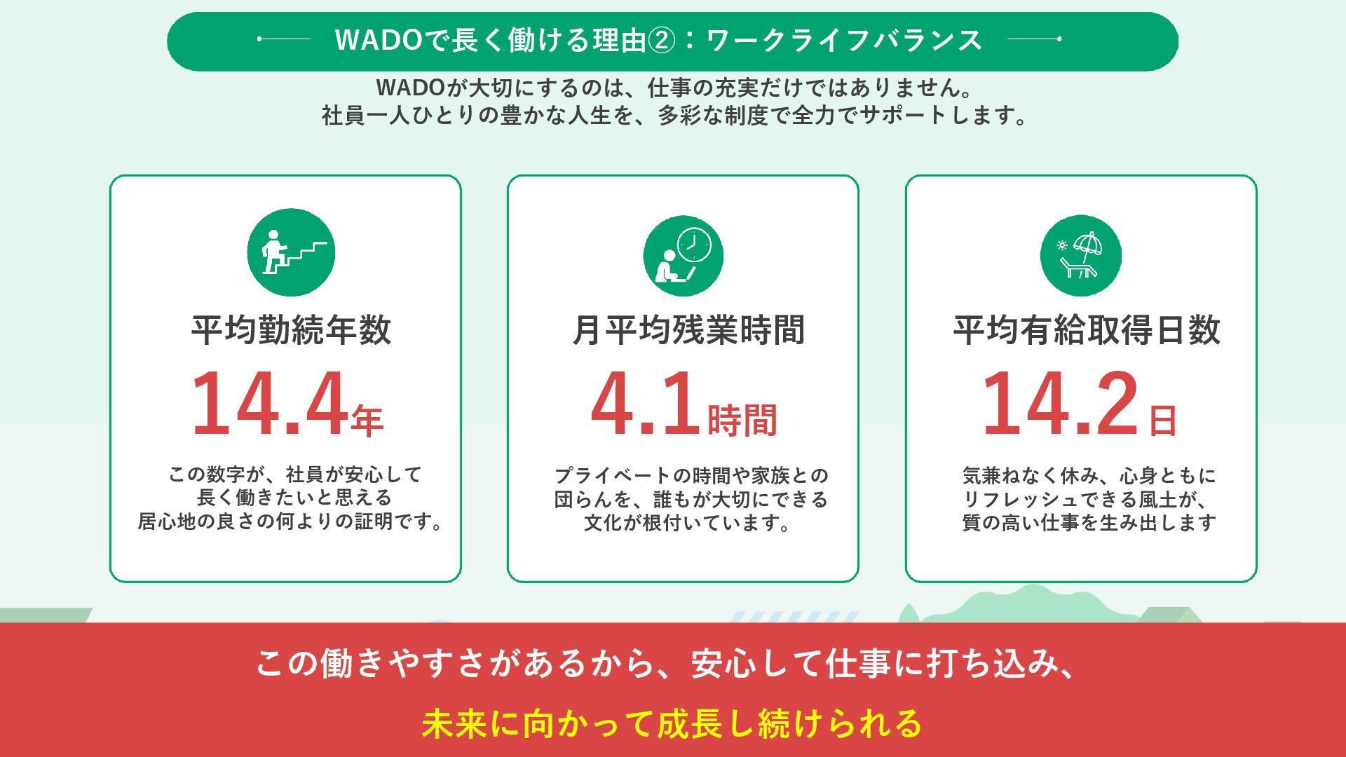 プライベートの時間や家族との 団らんを、誰もが大切にできる 文化が根付いています。 4.1時間 平均有給取得日数 気兼ねなく休み、心身ともに リフレッシュできる風土が、 質の高い仕事を生み出します 14.2日 WADOで長く働ける理由②:ワークライフバランス