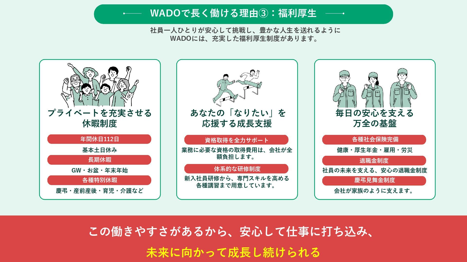 GW・お盆・年末年始 慶弔・産前産後・育児・介護など あなたの「なりたい」を 応援する成長支援 資格取得を全力サポート 体系的な研修制度 業務に必要な資格の取得費用は、会社が全 額負担します。 新入社員研修から、専門スキルを高める 各種講習まで用意しています。 毎日の安心を支える 万全の基盤 各種社会保険完備 退職金制度 慶弔見舞金制度 健康・厚生年金・雇用・労災 社員の未来を支える、安心の退職金制度 会社が家族のように支えます。 WADOで長く働ける理由③:福利厚生