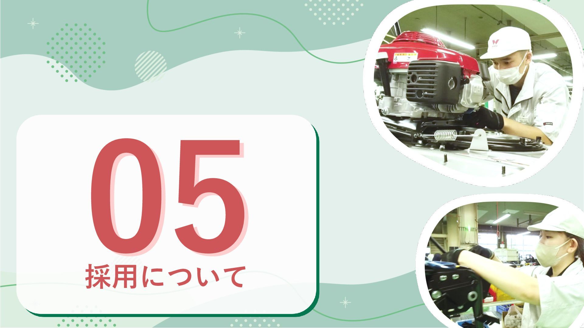 5. 01 文理不問の成長サポート体制 文理不問でも手厚い社員研修で安心スタート 技術研修や資格の費用は全額会社負担 働きながらスキルとキャリアをステップアップ 03 定着率96%が語る、人の魅力 「改善活動」で、誰もが主役になれる チーム一体で、最高のモノづくりに挑む 安心の基盤があるから、長く続けられる