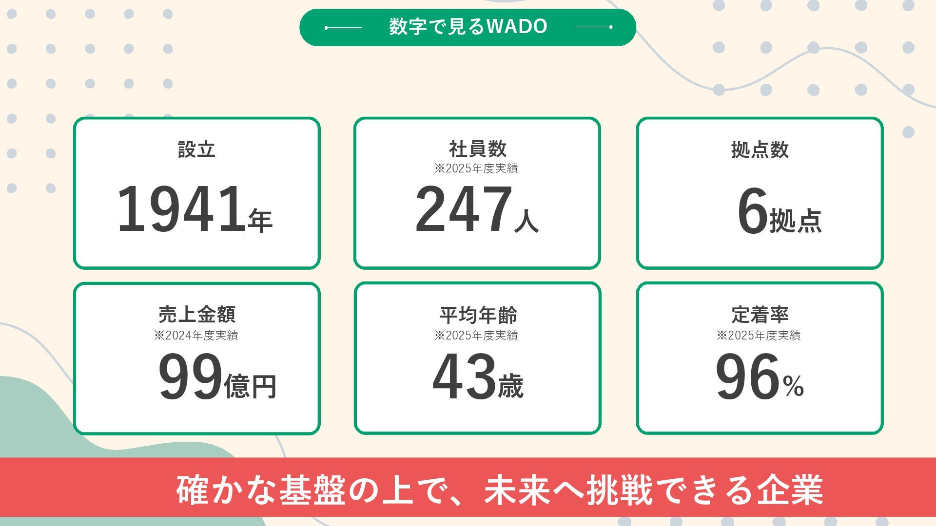 6拠点 設立 年 1941 売上金額 億円 99 確かな基盤の上で、未来へ挑戦できる企業 ※2024年度実績 ※2025年度実績 ※2025年度実績 ※2025年度実績 数字で見るWADO