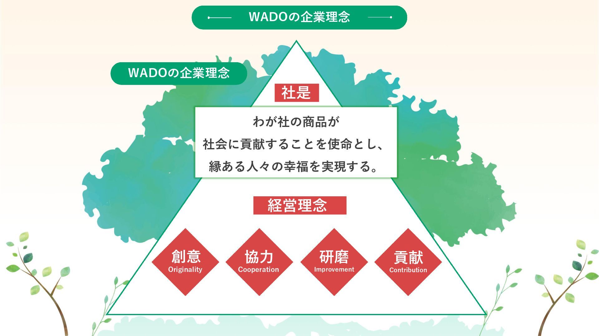 わが社の商品が 社会に貢献することを使命とし、 縁ある人々の幸福を実現する。 社是 WADOの企業理念