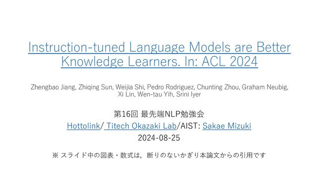 Zhengbao Jiang, Zhiqing Sun, Weijia Shi, Pedro Rodriguez, Chunting Zhou, Graham Neubig, Xi Lin, Wen-tau Yih, Srini Iyer 第16回 最先端NLP勉強会 Hottolink/ Titech Okazaki Lab/AIST: Sakae Mizuki 2024-08-25 ※ スライド中の図表・数式は,断りのないかぎり本論文からの引用です