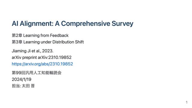 Learning under Distribution Shift Jiaming Ji et al., 2023. arXiv preprint arXiv:2310.19852 https://arxiv.org/abs/2310.19852 第99回汎用人工知能輪読会 2024/1/19 担当: 太田 晋 1