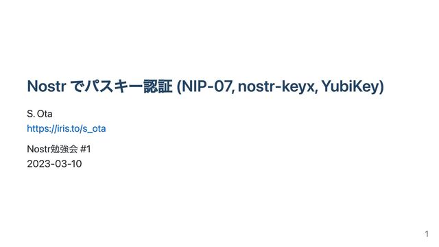 Nostr でパスキー認証 (NIP-07, nostr-keyx, YubiKey) S. Ota https://iris.to/s_ota Nostr勉強会 #1
