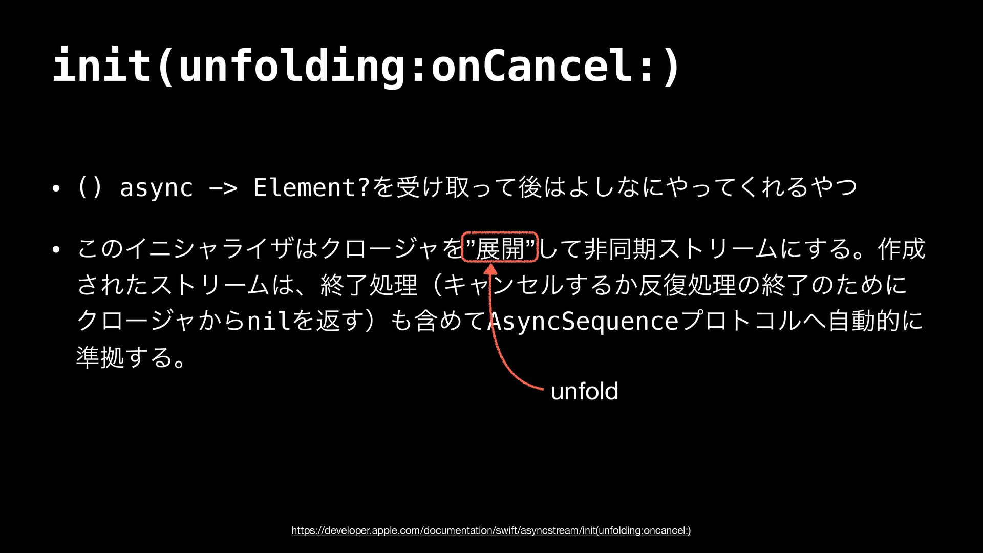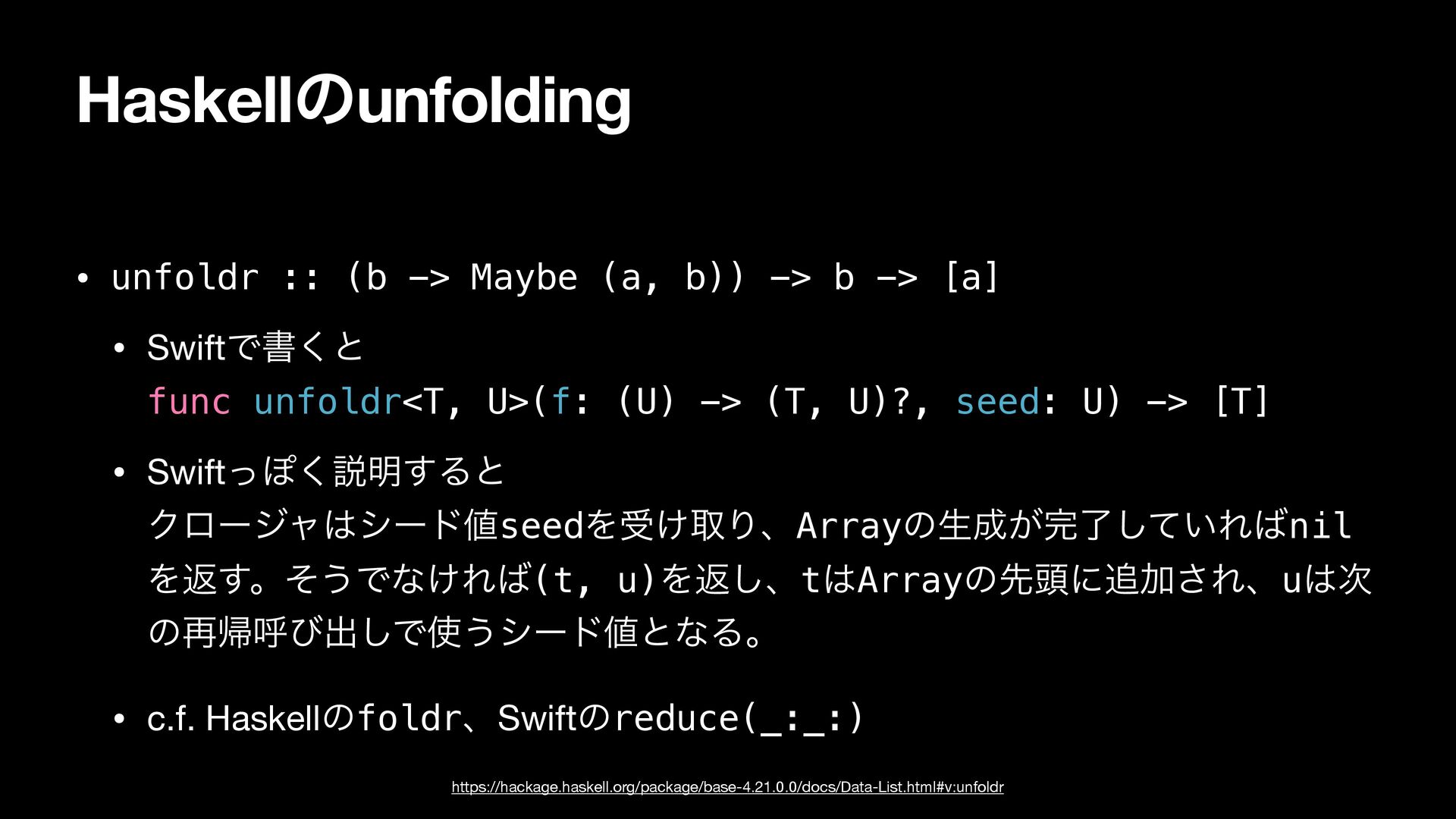 ΫϩʔδϟγʔυseedΛड͚औΓɺArrayͷੜ͕͍ྃͯ͠Εnil Λฦ͢ɻͦ͏Ͱͳ͚Ε(t, u)Λฦ͠ɺtArrayͷઌ಄ʹՃ͞Εɺu࣍ ͷ࠶ؼݺͼग़͠Ͱ͏γʔυͱͳΔɻ • c.f. HaskellͷfoldrɺSwiftͷreduce(_:_:) https://hackage.haskell.org/package/base-4.21.0.0/docs/Data-List.html#v:unfoldr