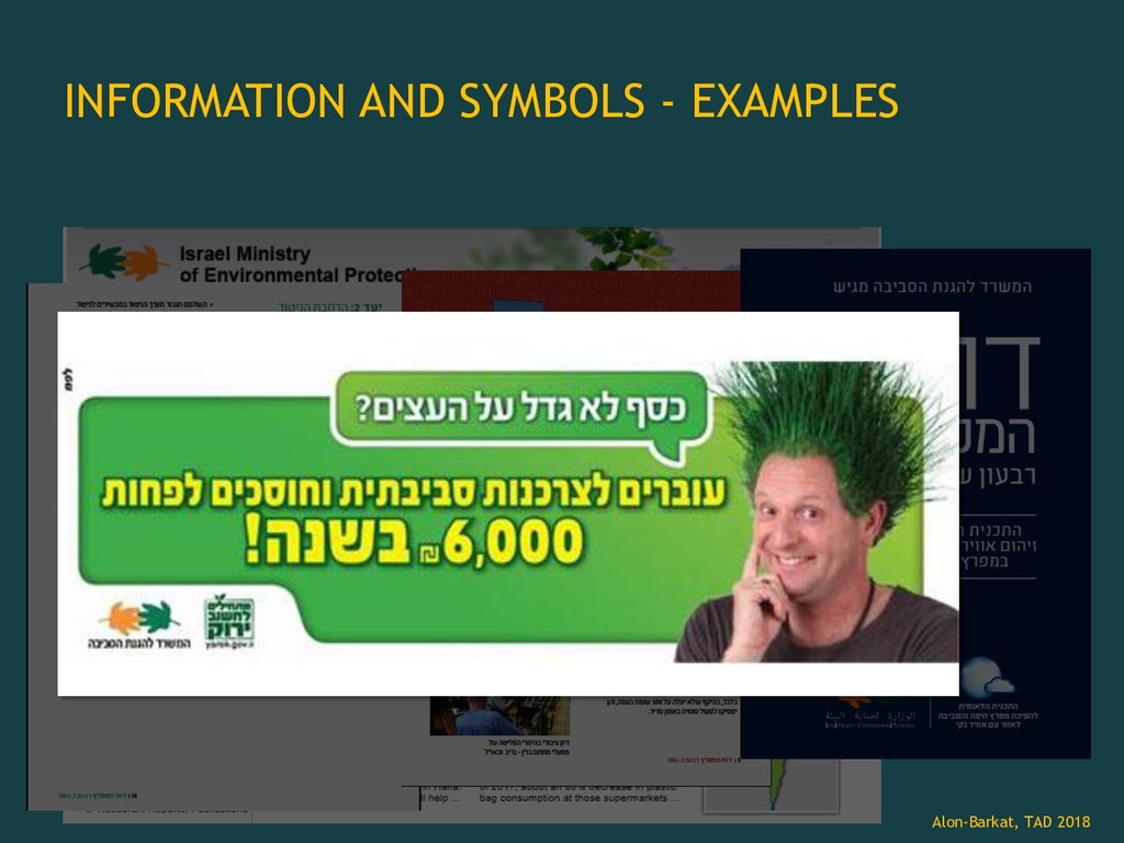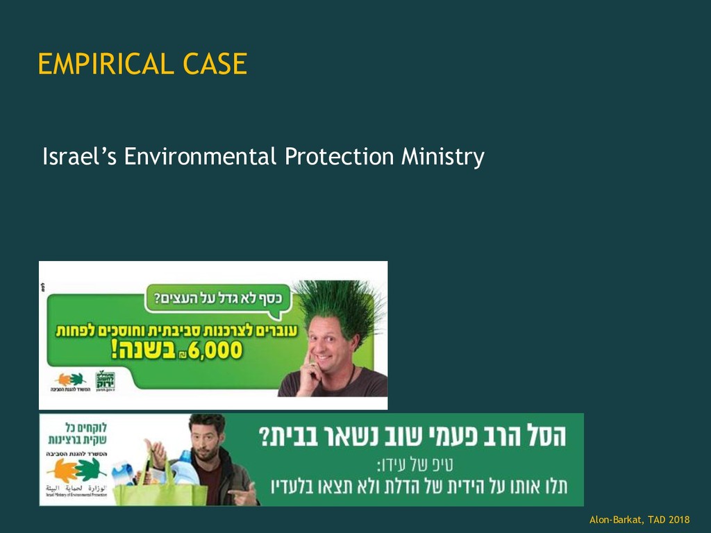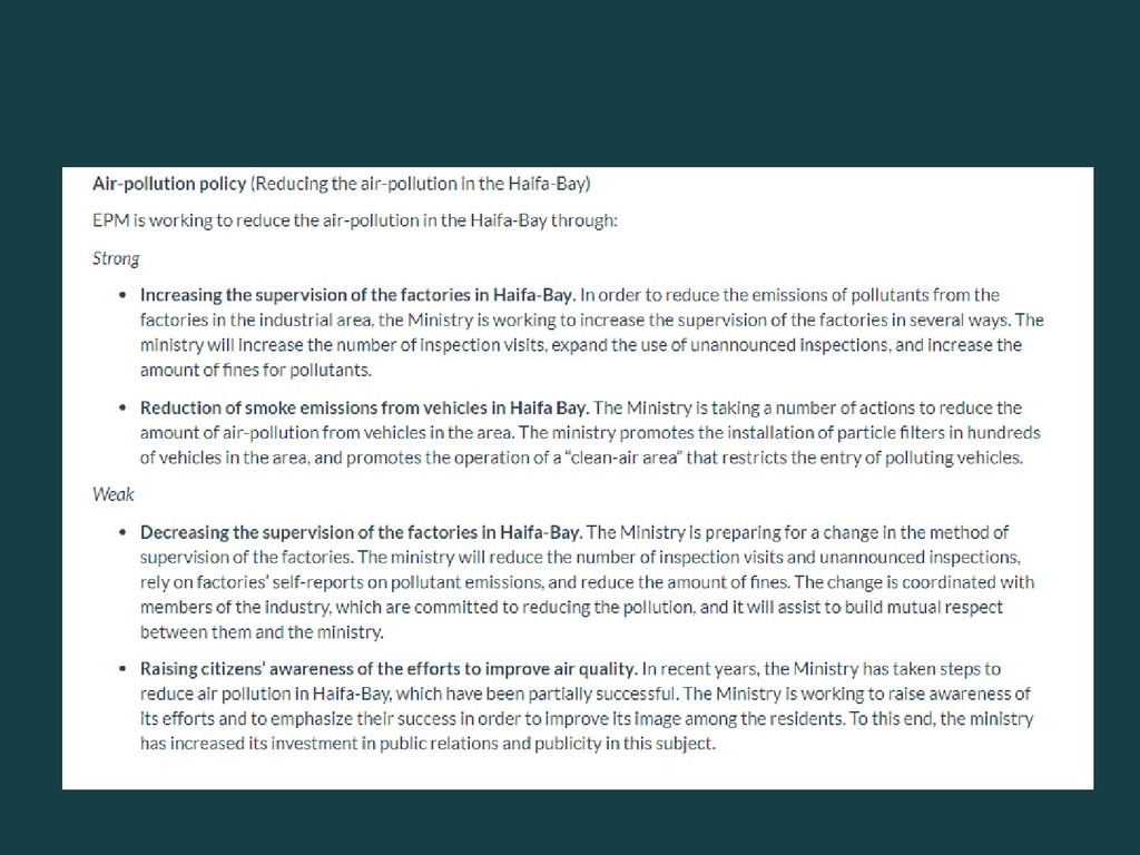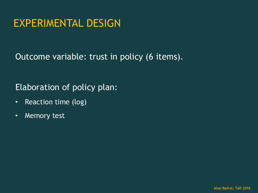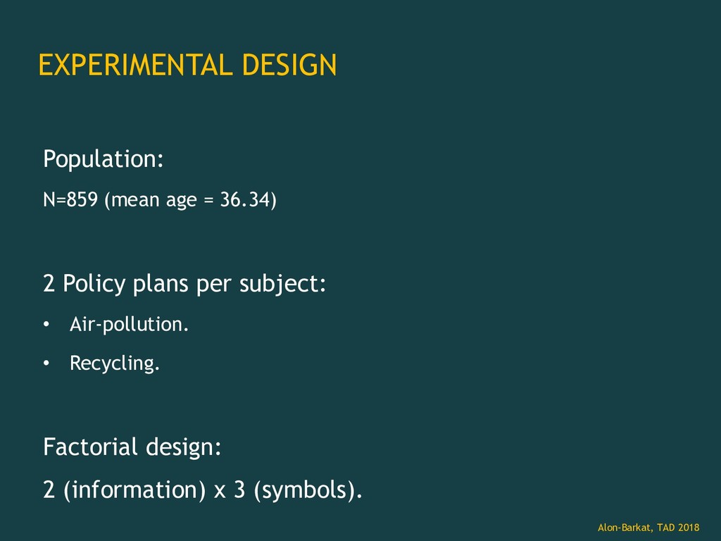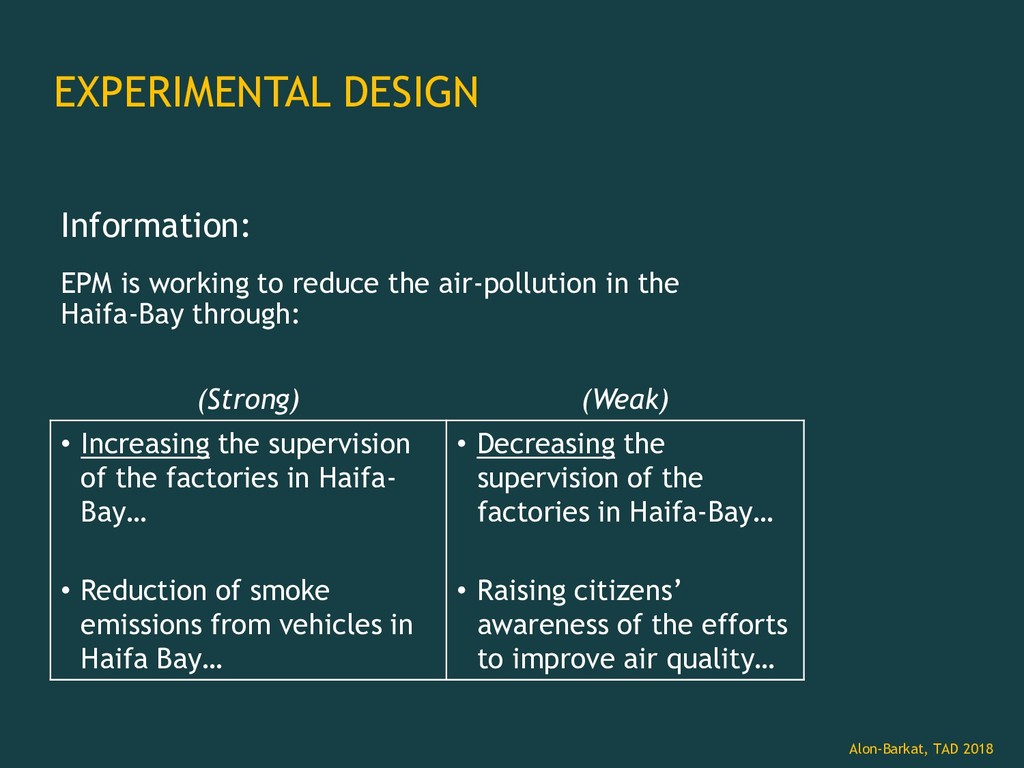 Haifa-Bay through: EXPERIMENTAL DESIGN (Weak) (Strong) • Decreasing the supervision of the factories in Haifa-Bay… • Increasing the supervision of the factories in Haifa- Bay… • Raising citizens’ awareness of the efforts to improve air quality… • Reduction of smoke emissions from vehicles in Haifa Bay… Alon-Barkat, TAD 2018