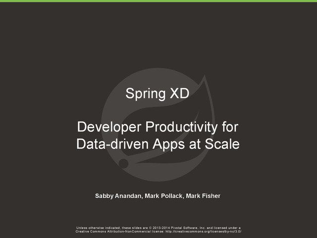 Software, Inc. and licensed under a Creative Commons Attribution-NonCommercial license: http://creativecommons.org/licenses/by-nc/3.0/ • Custom Modules and HDFS • UI Canvas: ◦ create, visualize and deploy data pipelines ◦ metrics and monitoring capabilities • Enrichment: OOTB modules/jobs • Apache Ambari Support • Security Enhancements • Spring XD on Pivotal Cloud Foundry (GA Release: May 2015) Roadmap