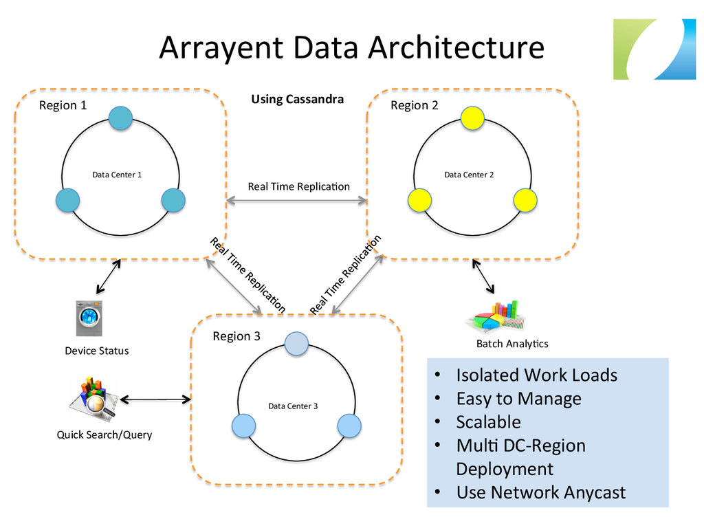 1 Data Center 2 Data Center 3 Batch Analy:cs Quick Search/Query Device Status Region 1 Region 2 Region 3 Using Cassandra • Isolated Work Loads • Easy to Manage • Scalable • Mul: DC-‐Region Deployment • Use Network Anycast