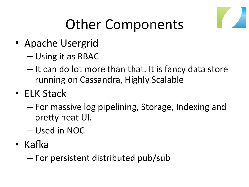 RBAC – It can do lot more than that. It is fancy data store running on Cassandra, Highly Scalable • ELK Stack – For massive log pipelining, Storage, Indexing and pre`y neat UI. – Used in NOC • Kaia – For persistent distributed pub/sub