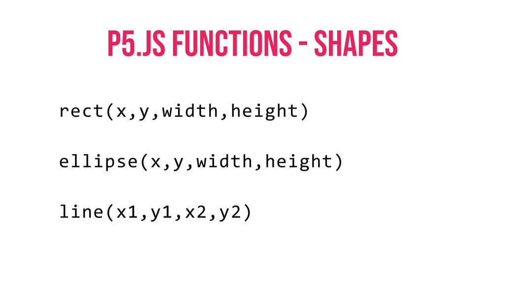 rect(x,y,width,height) ellipse(x,y,width,height) line(x1,y1,x2,y2)