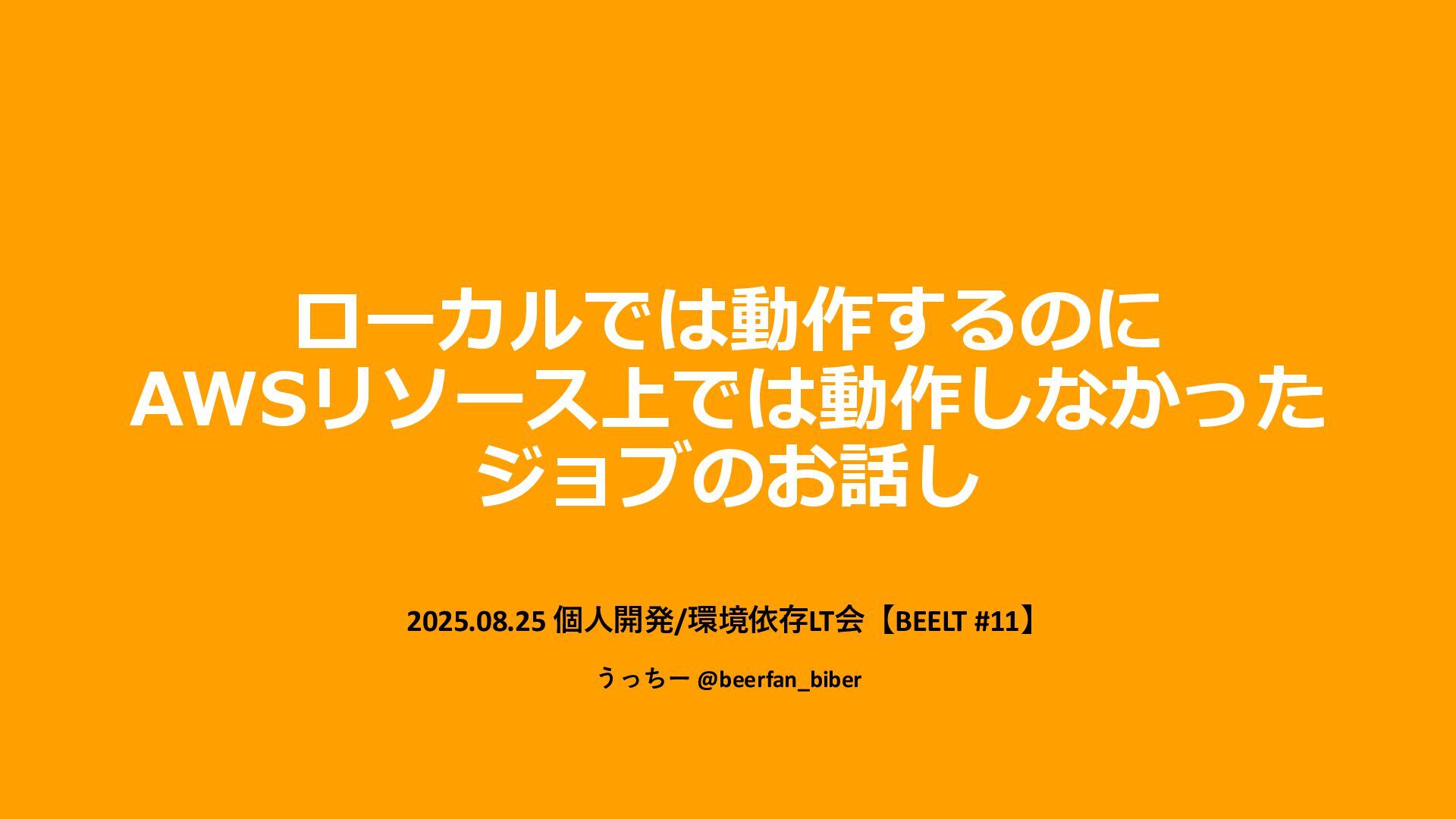 ローカルでは動作するのに AWSリソース上では動作しなかった ジョブのお話し 2025.08.25 個人開発/環境依存LT会【BEELT #11】 うっちー @beerfan_biber