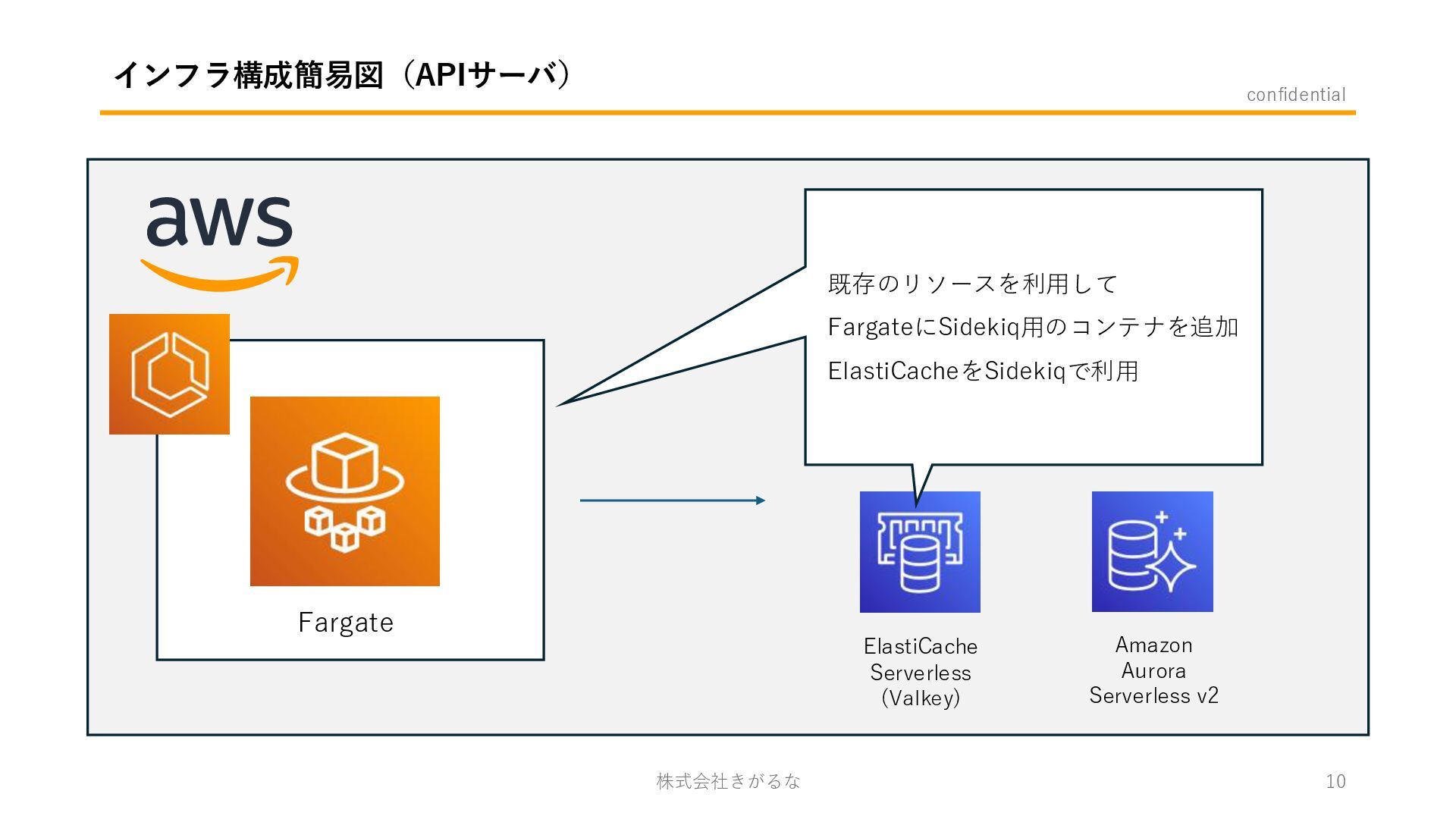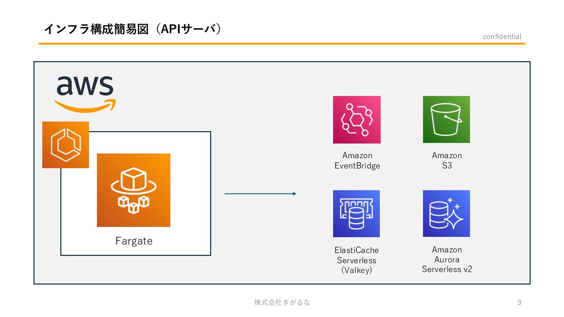 confidential インフラ構成簡易図(APIサーバ) 株式会社きがるな 9 Fargate ElastiCache Serverless (Valkey) Amazon Aurora