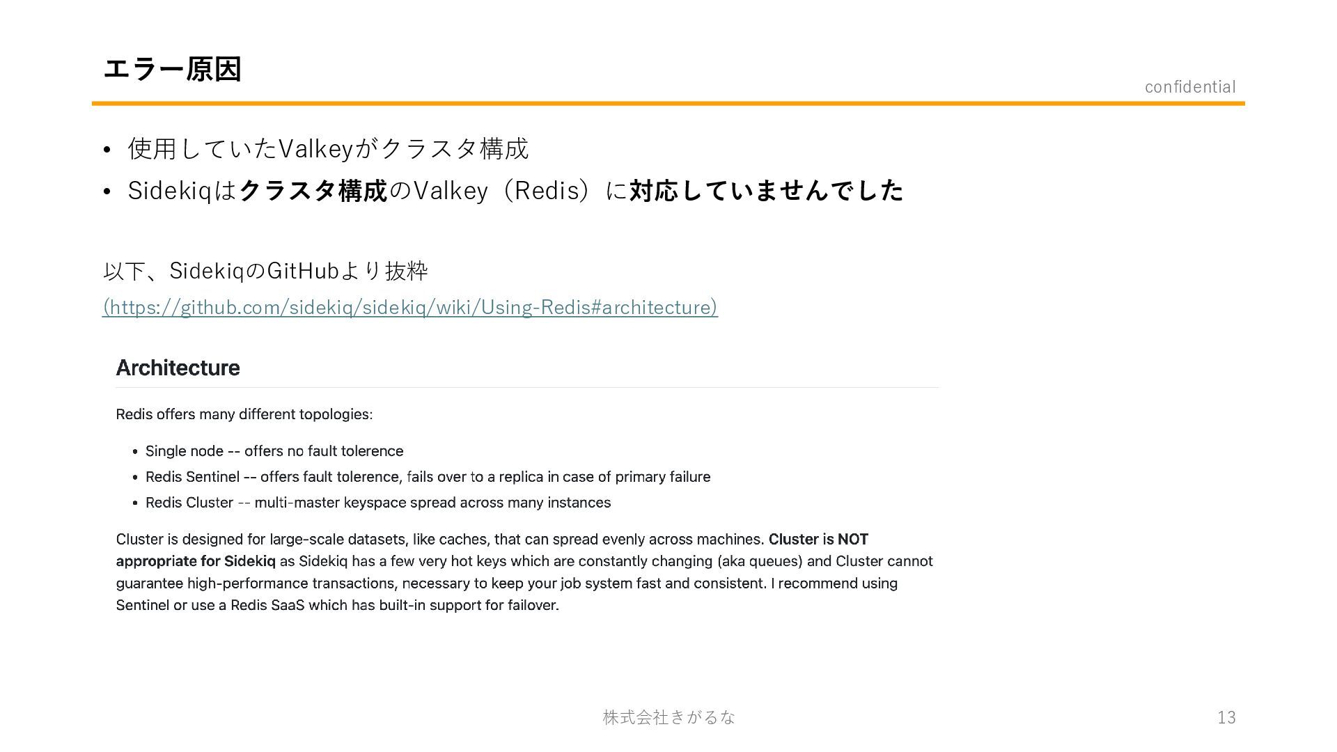confidential エラー原因 • 使用していたValkeyがクラスタ構成 • Sidekiqはクラスタ構成のValkey(Redis)に対応していませんでした 以下、SidekiqのGitHubより抜粋 (https://github.com/sidekiq/sidekiq/wiki/Using-Redis#architecture) 株式会社きがるな 13