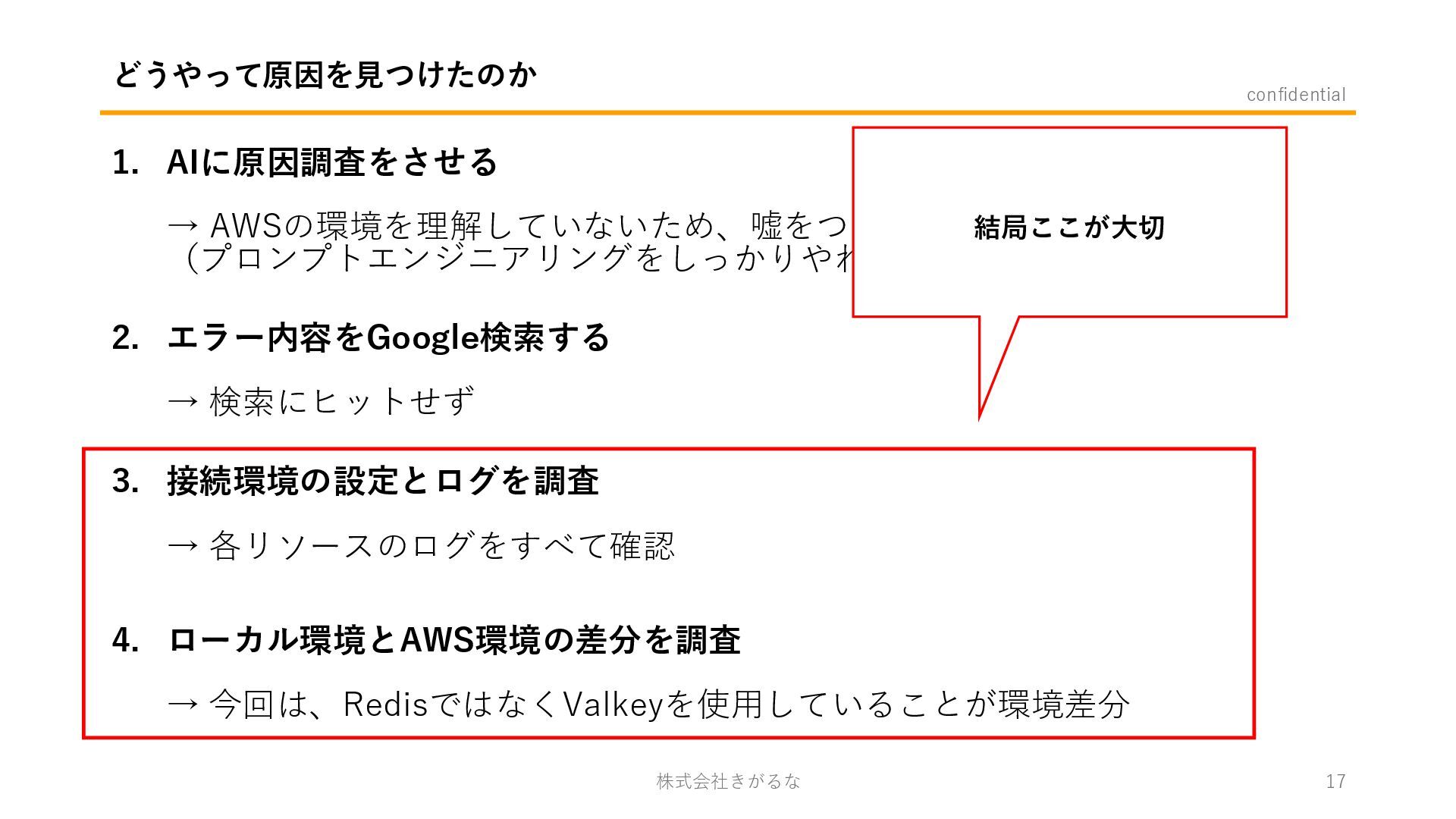 confidential どうやって原因を見つけたのか 1. AIに原因調査をさせる → AWSの環境を理解していないため、嘘をつきまくる (プロンプトエンジニアリングをしっかりやれば結果は変わりそう) 2. エラー内容をGoogle検索する →