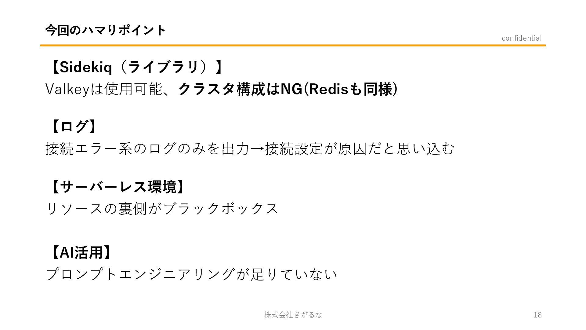 confidential 今回のハマりポイント 【Sidekiq(ライブラリ)】 Valkeyは使用可能、クラスタ構成はNG(Redisも同様) 【ログ】 接続エラー系のログのみを出力→接続設定が原因だと思い込む 【サーバーレス環境】 リソースの裏側がブラックボックス 【AI活用】 プロンプトエンジニアリングが足りていない