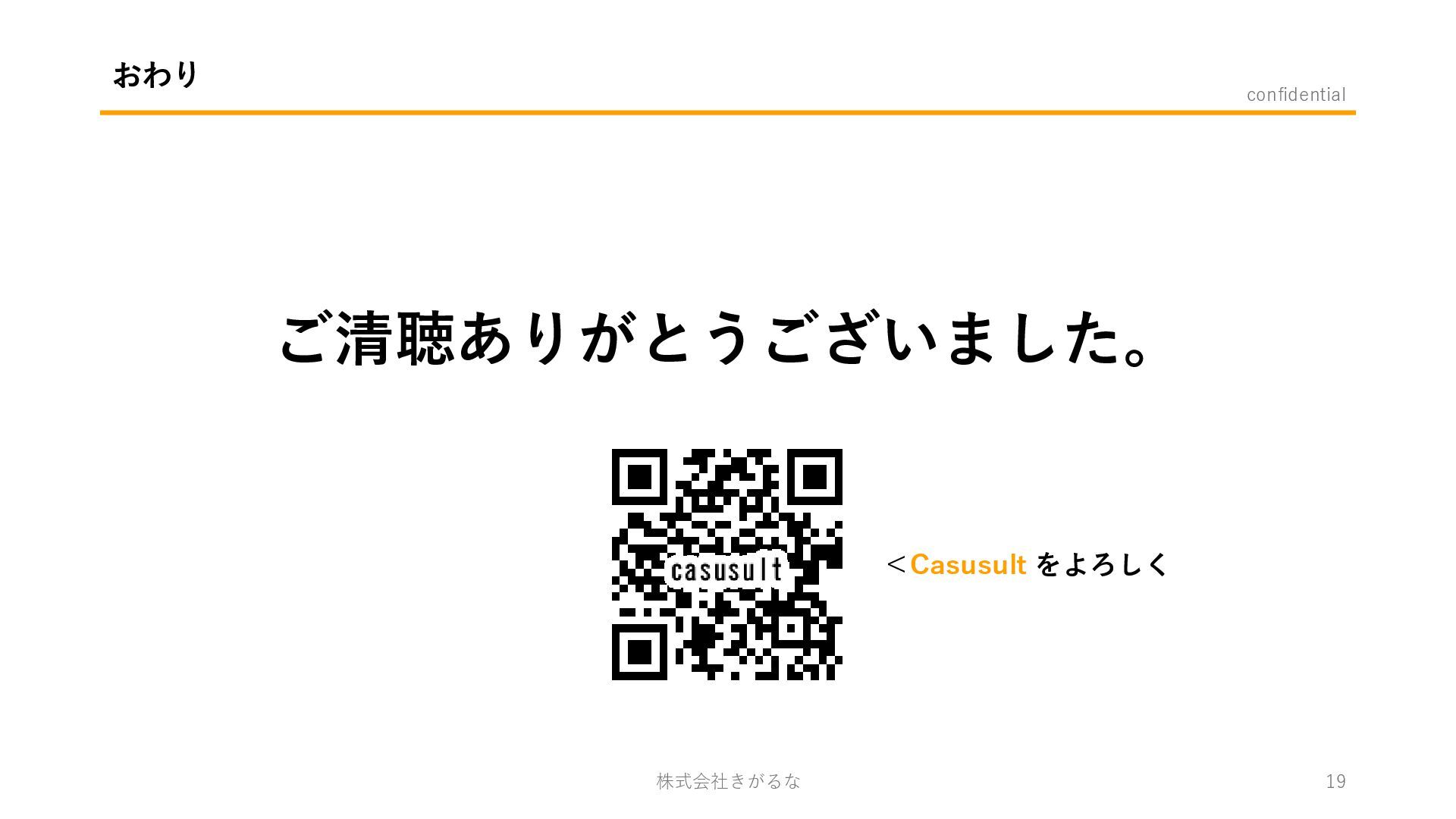 confidential おわり ご清聴ありがとうございました。 株式会社きがるな 19 <Casusult をよろしく