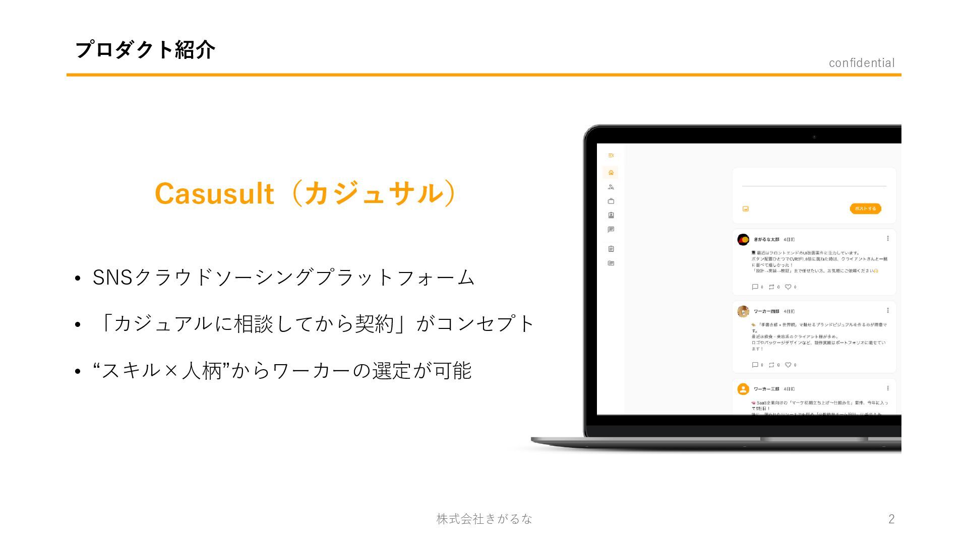 confidential プロダクト紹介 Casusult(カジュサル) • SNSクラウドソーシングプラットフォーム • 「カジュアルに相談してから契約」がコンセプト • “スキル×人柄”からワーカーの選定が可能 株式会社きがるな