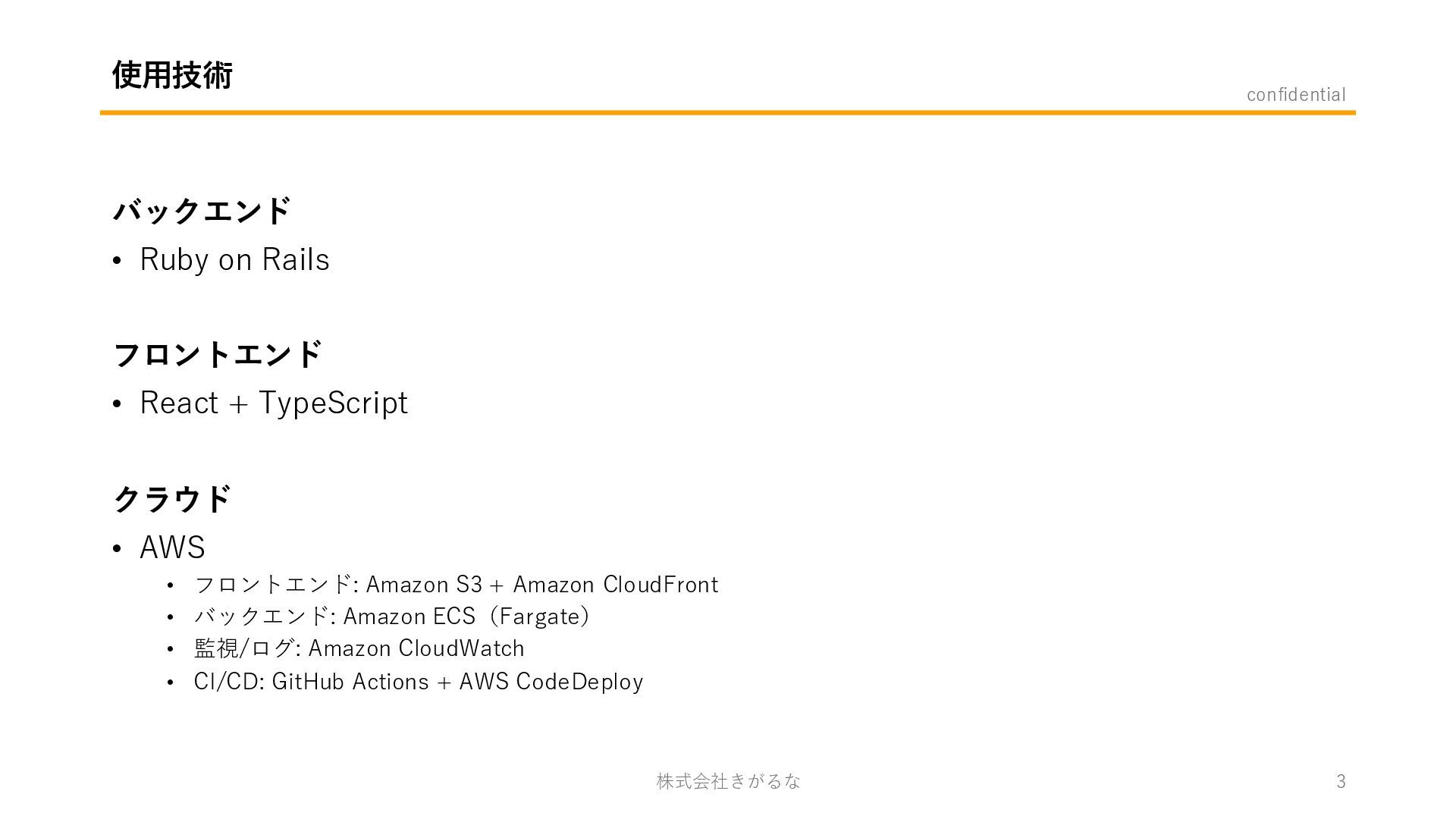 + TypeScript クラウド • AWS • フロントエンド: Amazon S3 + Amazon CloudFront • バックエンド: Amazon ECS(Fargate) • 監視/ログ: Amazon CloudWatch • CI/CD: GitHub Actions + AWS CodeDeploy 株式会社きがるな 3