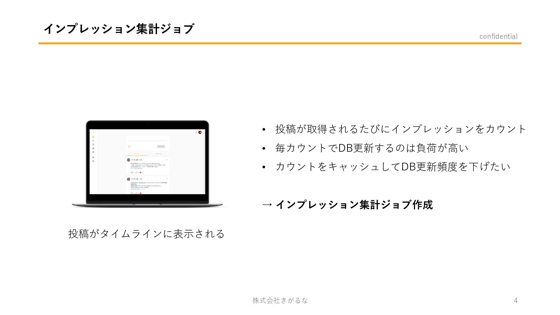 confidential インプレッション集計ジョブ 株式会社きがるな 7 投稿がタイムラインに表示される 非同期でジョブを実行