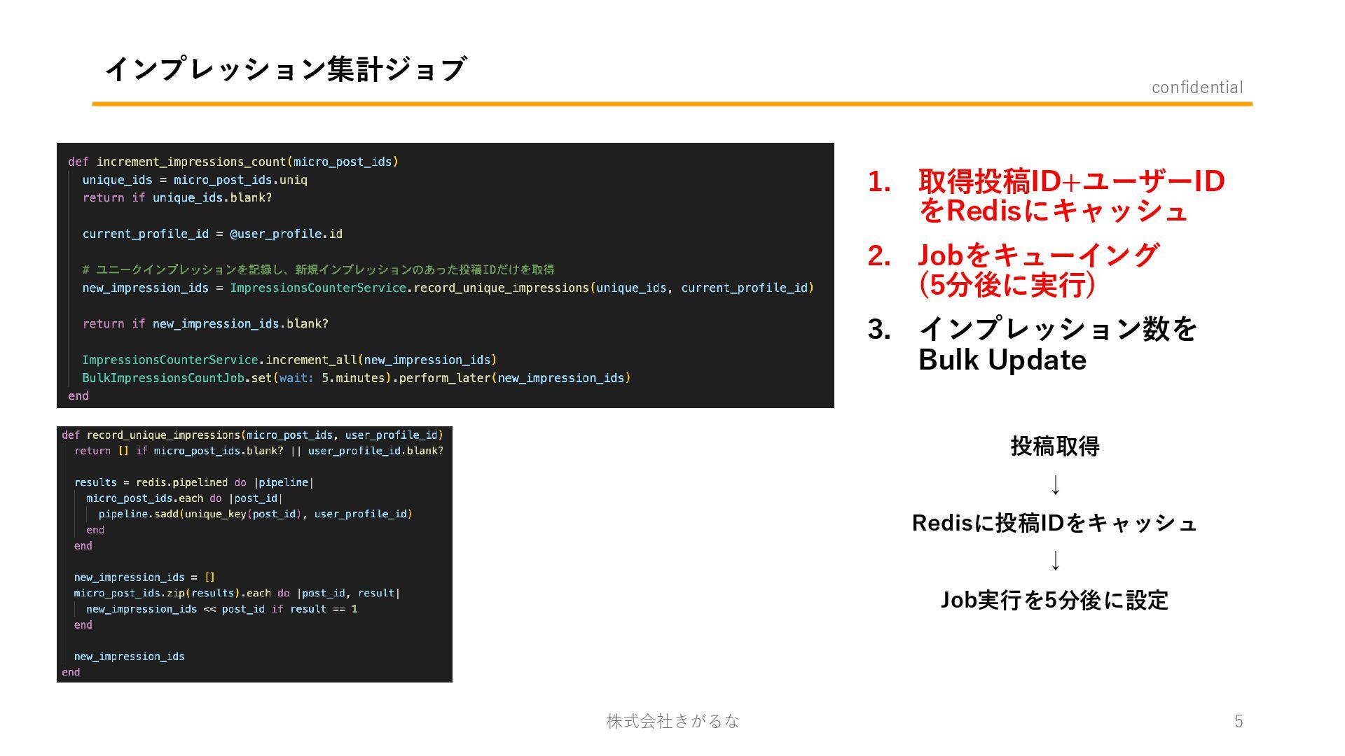 confidential インプレッション集計ジョブ 株式会社きがるな 4 投稿がタイムラインに表示される • 投稿が取得されるたびにインプレッションをカウント • 毎カウントでDB更新するのは負荷が高い •
