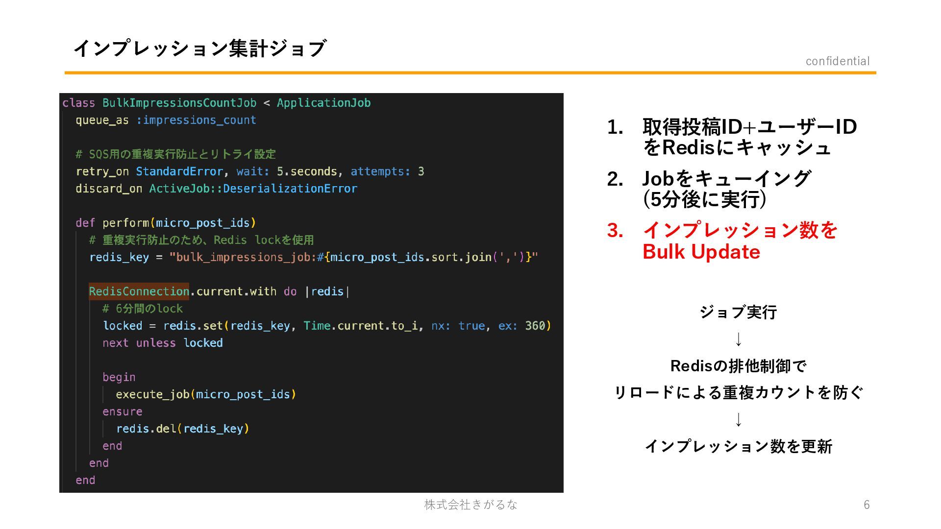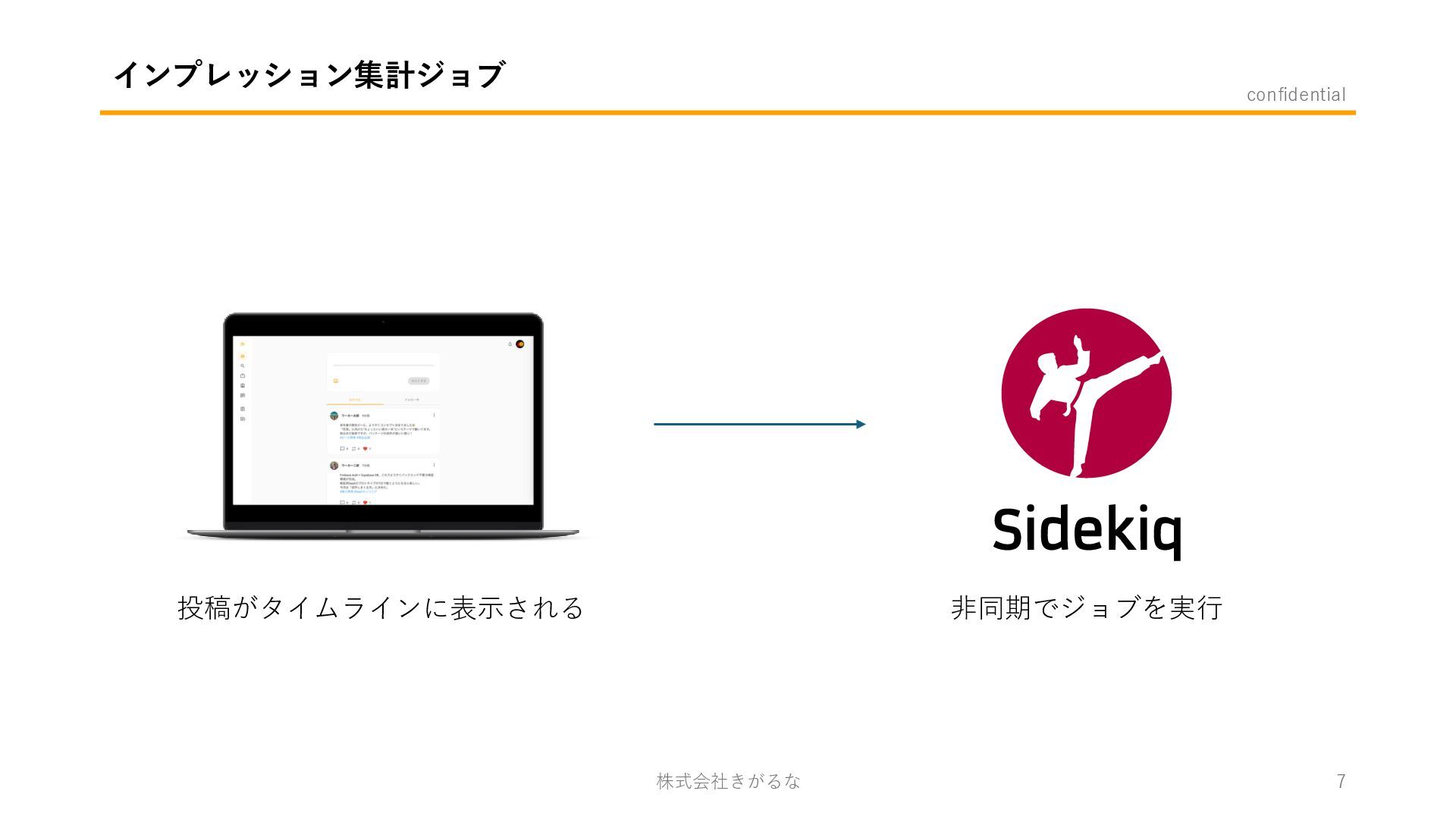 confidential インプレッション集計ジョブ 株式会社きがるな 6 1. 取得投稿ID+ユーザーID をRedisにキャッシュ 2. Jobをキューイング (5分後に実行)