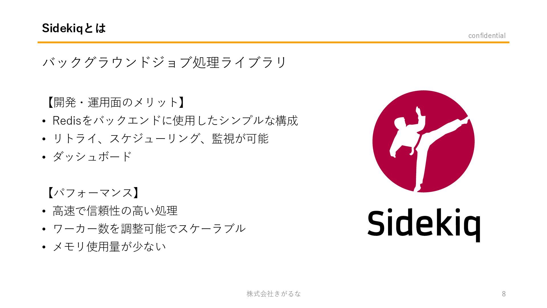 confidential Sidekiqとは バックグラウンドジョブ処理ライブラリ 【開発・運用面のメリット】 • Redisをバックエンドに使用したシンプルな構成 • リトライ、スケジューリング、監視が可能 • ダッシュボード