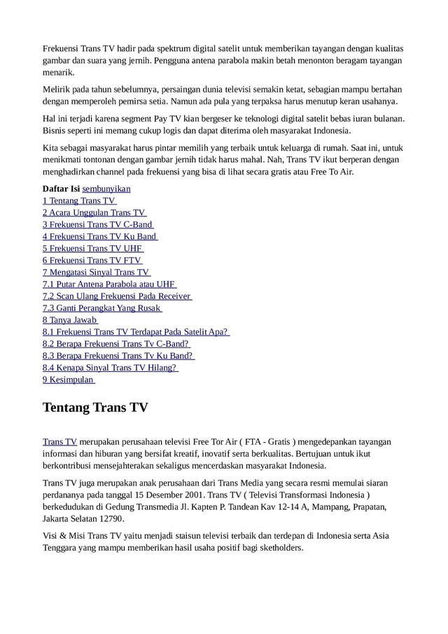 tayangan dengan kualitas gambar dan suara yang jernih. Pengguna antena parabola makin betah menonton beragam tayangan menarik. Melirik pada tahun sebelumnya, persaingan dunia televisi semakin ketat, sebagian mampu bertahan dengan memperoleh pemirsa setia. Namun ada pula yang terpaksa harus menutup keran usahanya. Hal ini terjadi karena segment Pay TV kian bergeser ke teknologi digital satelit bebas iuran bulanan. Bisnis seperti ini memang cukup logis dan dapat diterima oleh masyarakat Indonesia. Kita sebagai masyarakat harus pintar memilih yang terbaik untuk keluarga di rumah. Saat ini, untuk menikmati tontonan dengan gambar jernih tidak harus mahal. Nah, Trans TV ikut berperan dengan menghadirkan channel pada frekuensi yang bisa di lihat secara gratis atau Free To Air. Daftar Isi sembunyikan 1 Tentang Trans TV 2 Acara Unggulan Trans TV 3 Frekuensi Trans TV C-Band 4 Frekuensi Trans TV Ku Band 5 Frekuensi Trans TV UHF 6 Frekuensi Trans TV FTV 7 Mengatasi Sinyal Trans TV 7.1 Putar Antena Parabola atau UHF 7.2 Scan Ulang Frekuensi Pada Receiver 7.3 Ganti Perangkat Yang Rusak 8 Tanya Jawab 8.1 Frekuensi Trans TV Terdapat Pada Satelit Apa? 8.2 Berapa Frekuensi Trans Tv C-Band? 8.3 Berapa Frekuensi Trans Tv Ku Band? 8.4 Kenapa Sinyal Trans TV Hilang? 9 Kesimpulan Tentang Trans TV Trans TV merupakan perusahaan televisi Free Tor Air ( FTA - Gratis ) mengedepankan tayangan informasi dan hiburan yang bersifat kreatif, inovatif serta berkualitas. Bertujuan untuk ikut berkontribusi mensejahterakan sekaligus mencerdaskan masyarakat Indonesia. Trans TV juga merupakan anak perusahaan dari Trans Media yang secara resmi memulai siaran perdananya pada tanggal 15 Desember 2001. Trans TV ( Televisi Transformasi Indonesia ) berkedudukan di Gedung Transmedia Jl. Kapten P. Tandean Kav 12-14 A, Mampang, Prapatan, Jakarta Selatan 12790. Visi & Misi Trans TV yaitu menjadi staisun televisi terbaik dan terdepan di Indonesia serta Asia Tenggara yang mampu memberikan hasil usaha positif bagi sketholders.