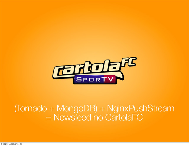 mongo por instância de tornado newsfeed problemas enfrentados ✓ asyncmongo: bliblioteca para acessar o mongo de forma assíncrona utilizando o tornado ioloop - dobramos a quantidade suportada no post - aumentamos em 40% a quantidade suportada no get das mensagens Friday, October 4, 13