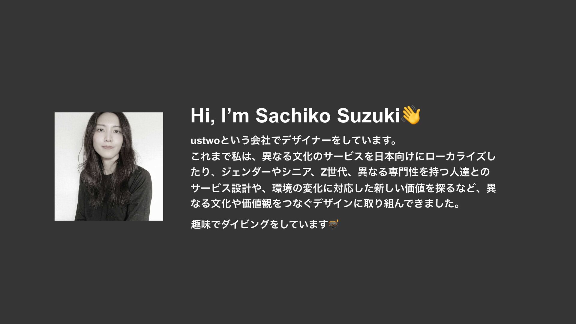Hi, I’m Sachiko Suzuki👋 ustwoͱ͍͏ձࣾͰσβΠφʔΛ͍ͯ͠·͢ɻ ͜Ε·ͰࢲɺҟͳΔจԽͷαʔϏεΛຊ͚ʹϩʔΧϥΠζ͠ ͨΓɺδΣϯμʔγχΞɺZੈɺҟͳΔઐੑΛ࣋ͭਓୡͱͷ αʔϏεઃܭɺڥͷมԽʹରԠͨ͠৽͍͠ՁΛ୳ΔͳͲɺҟ ͳΔจԽՁ؍Λͭͳ͙σβΠϯʹऔΓΜͰ͖·ͨ͠ɻ झຯͰμΠϏϯάΛ͍ͯ͠·͢🤿