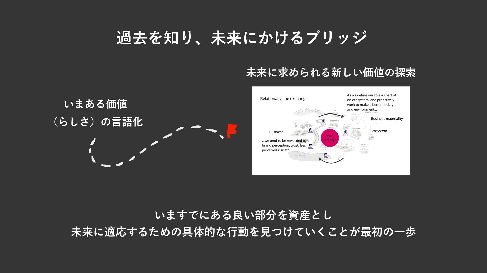 ͍·͢Ͱʹ͋Δྑ͍෦Λࢿ࢈ͱ͠ ະདྷʹదԠ͢ΔͨΊͷ۩ମతͳߦಈΛݟ͚͍ͭͯ͘͜ͱ͕࠷ॳͷҰา աڈΛΓɺະདྷʹ͔͚ΔϒϦοδ ͍·͋ΔՁ ʢΒ͠͞ʣͷݴޠԽ ະདྷʹٻΊΒΕΔ৽͍͠Ձͷ୳ࡧ