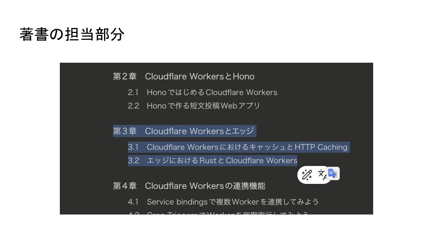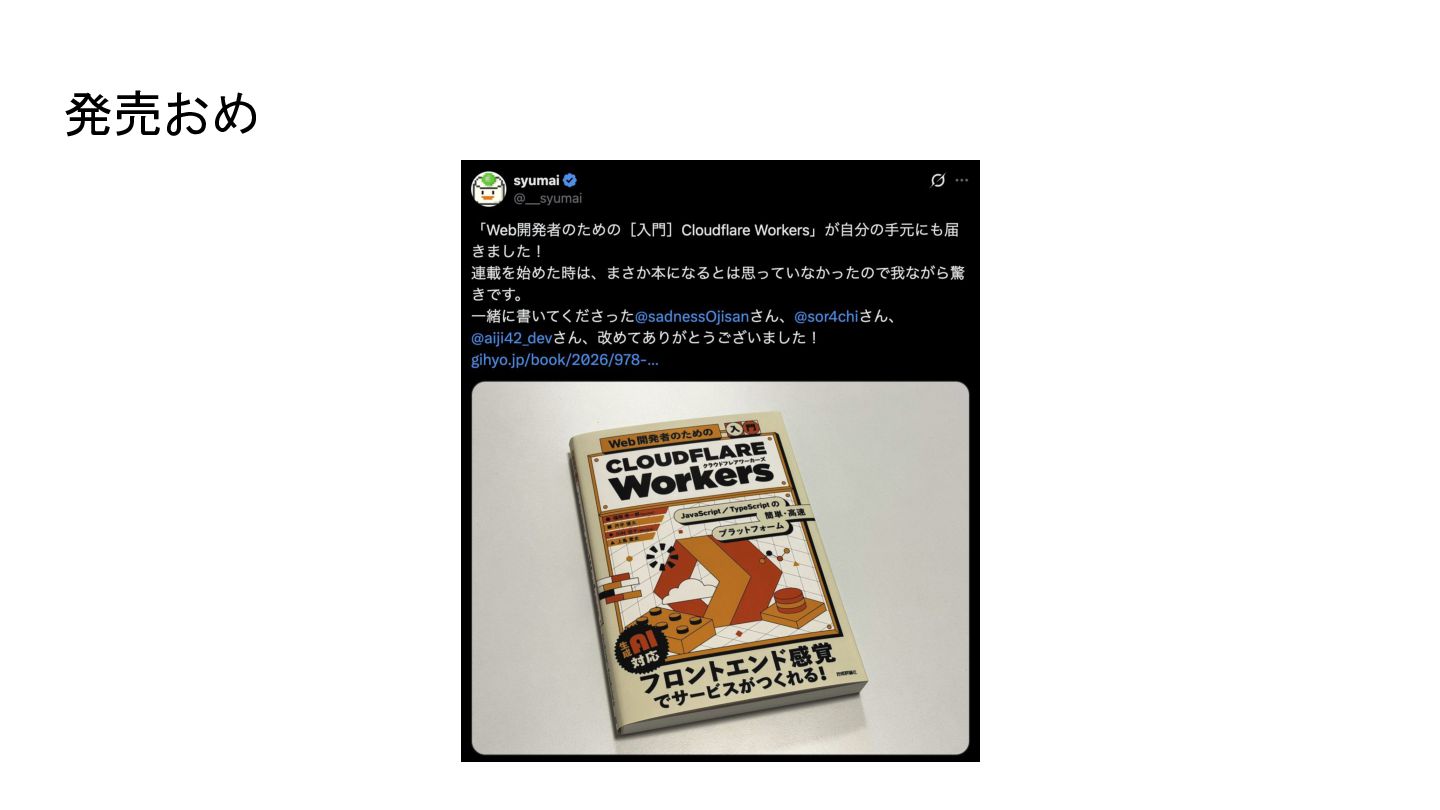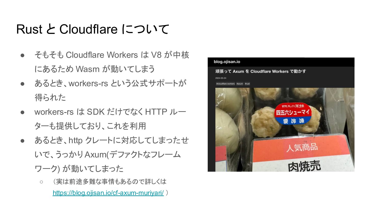が中核 にあるため Wasm が動いてしまう • あるとき、workers-rs という公式サポートが 得られた • workers-rs は SDK だけでなく HTTP ルー ターも提供しており、これを利用 • あるとき、http クレートに対応してしまったせ いで、うっかり Axum(デファクトなフレーム ワーク) が動いてしまった ◦ (実は前途多難な事情もあるので詳しくは https://blog.ojisan.io/cf-axum-muriyari/ )