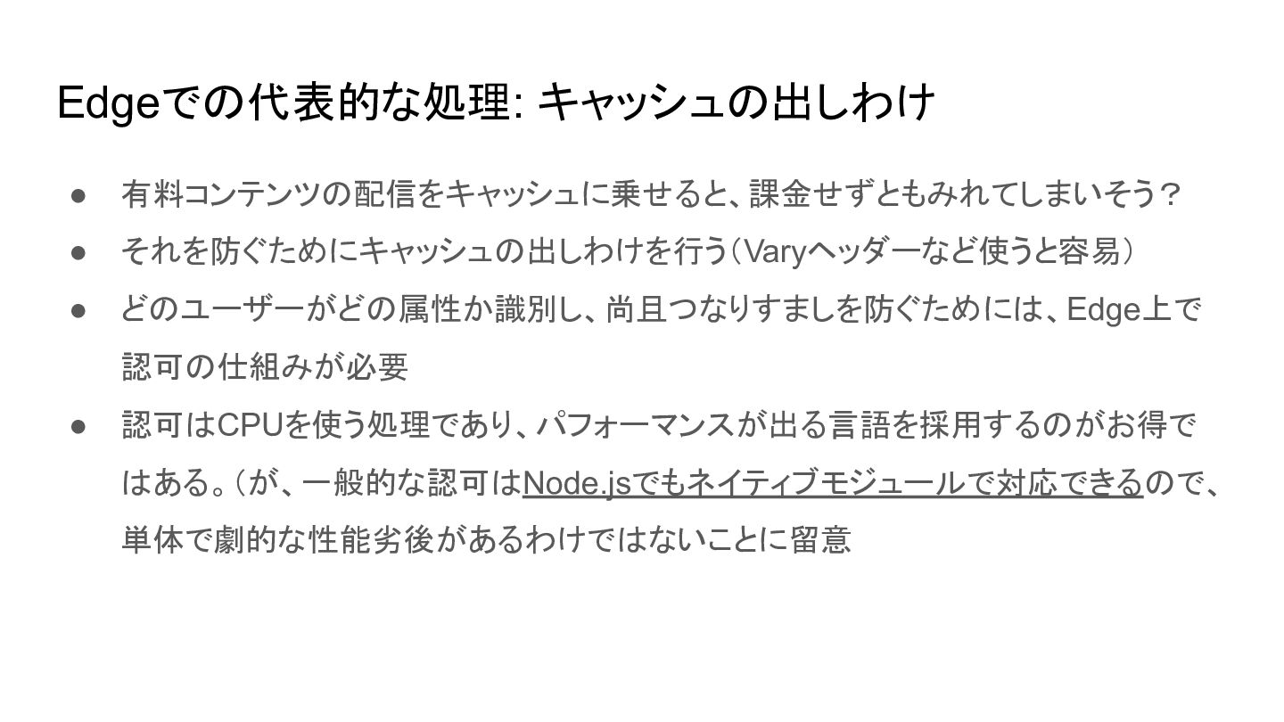 一方で有料コンテンツを扱う手前、キャッシュの 出しわけというロジックが実務上どうしても必要 となり、エッジでのコンピューティングに関心