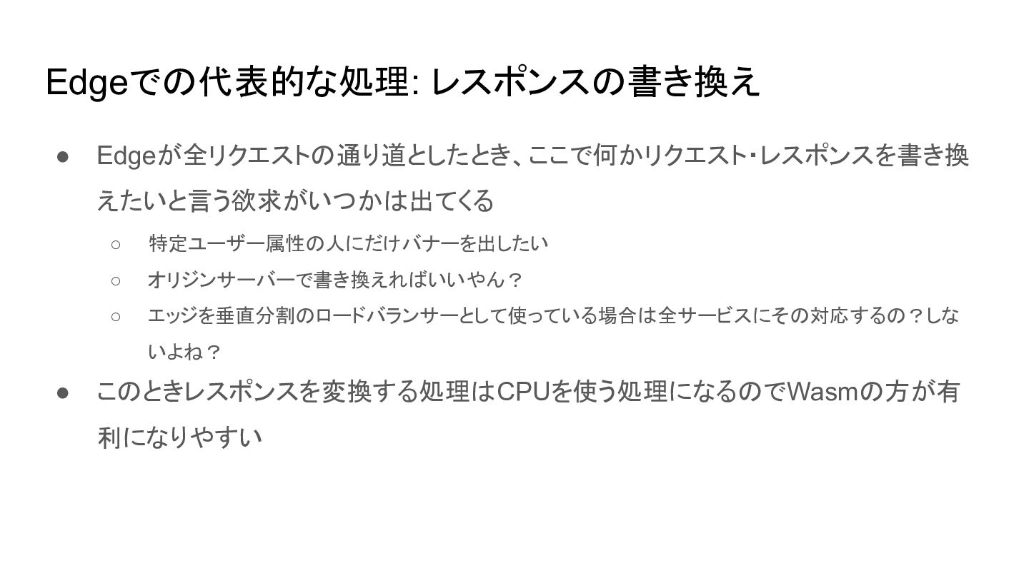 エッジを垂直分割のロードバランサーとして使っている場合は全サービスにその対応するの?しな いよね? • このときレスポンスを変換する処理はCPUを使う処理になるのでWasmの方が有 利になりやすい