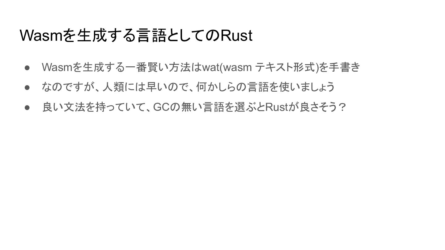 Wasmを生成する言語としてのRust • Wasmを生成する一番賢い方法はwat(wasm テキスト形式)を手書き • なのですが、人類には早いので、何かしらの言語を使いましょう • 良い文法を持っていて、GCの無い言語を選ぶとRustが良さそう?
