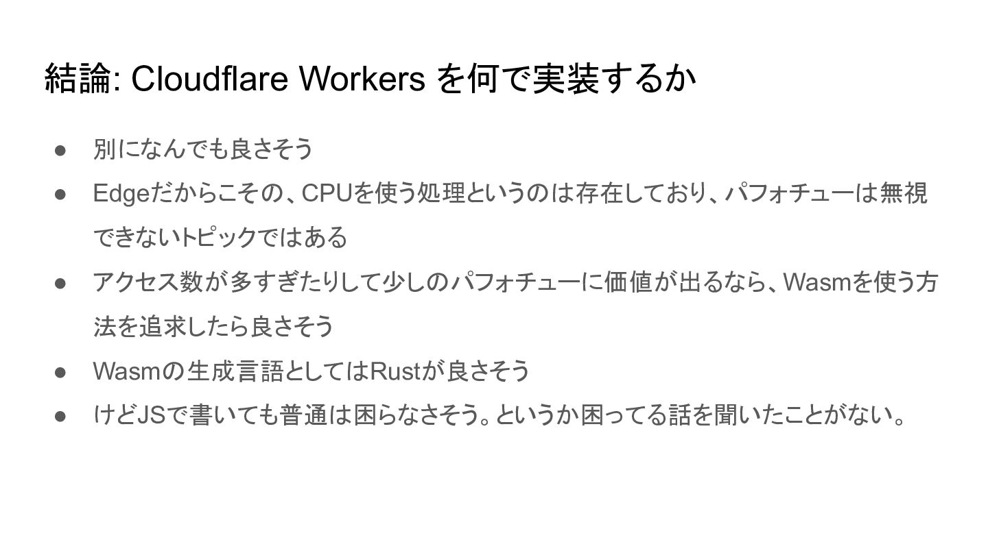 結論: Cloudflare Workers を何で実装するか • 別になんでも良さそう • Edgeだからこその、CPUを使う処理というのは存在しており、パフォチューは無視 できないトピックではある •