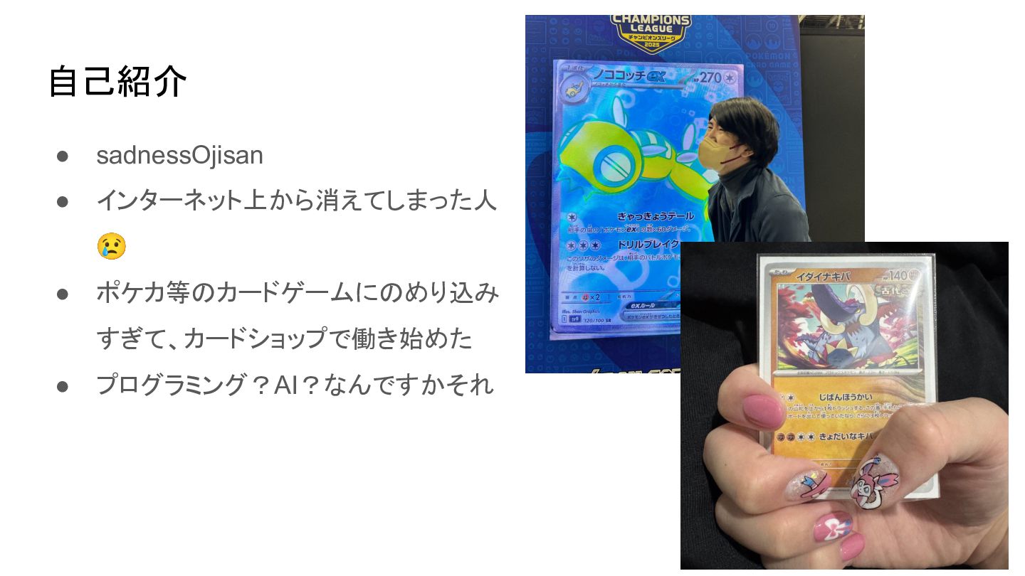 自己紹介 • sadnessOjisan • インターネット上から消えてしまった人 😢 • ポケカ等のカードゲームにのめり込み すぎて、カードショップで働き始めた •