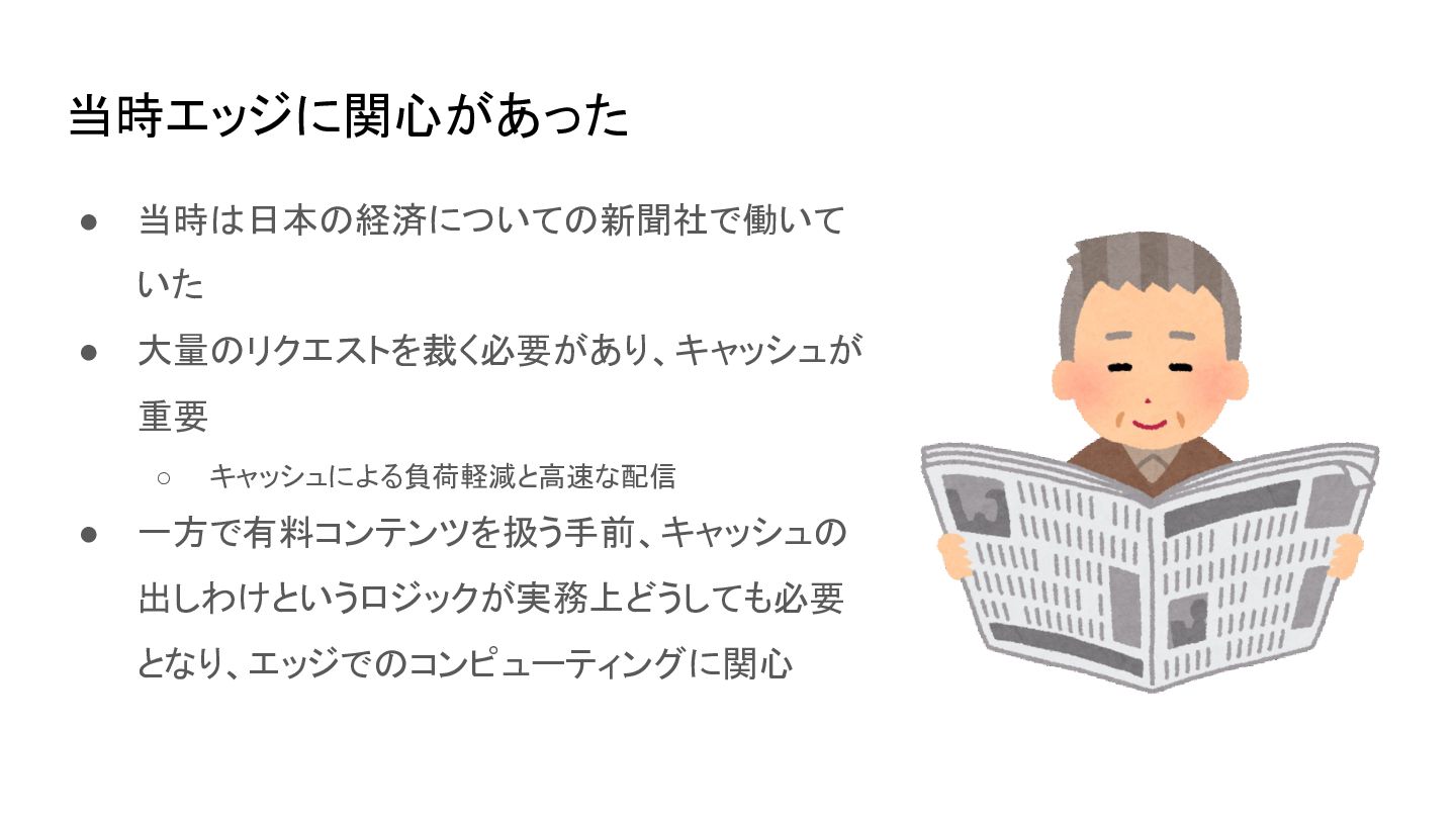 当時エッジに関心があった • 当時は日本の経済についての新聞社で働いて いた • 大量のリクエストを裁く必要があり、キャッシュが 重要 ◦ キャッシュによる負荷軽減と高速な配信 •