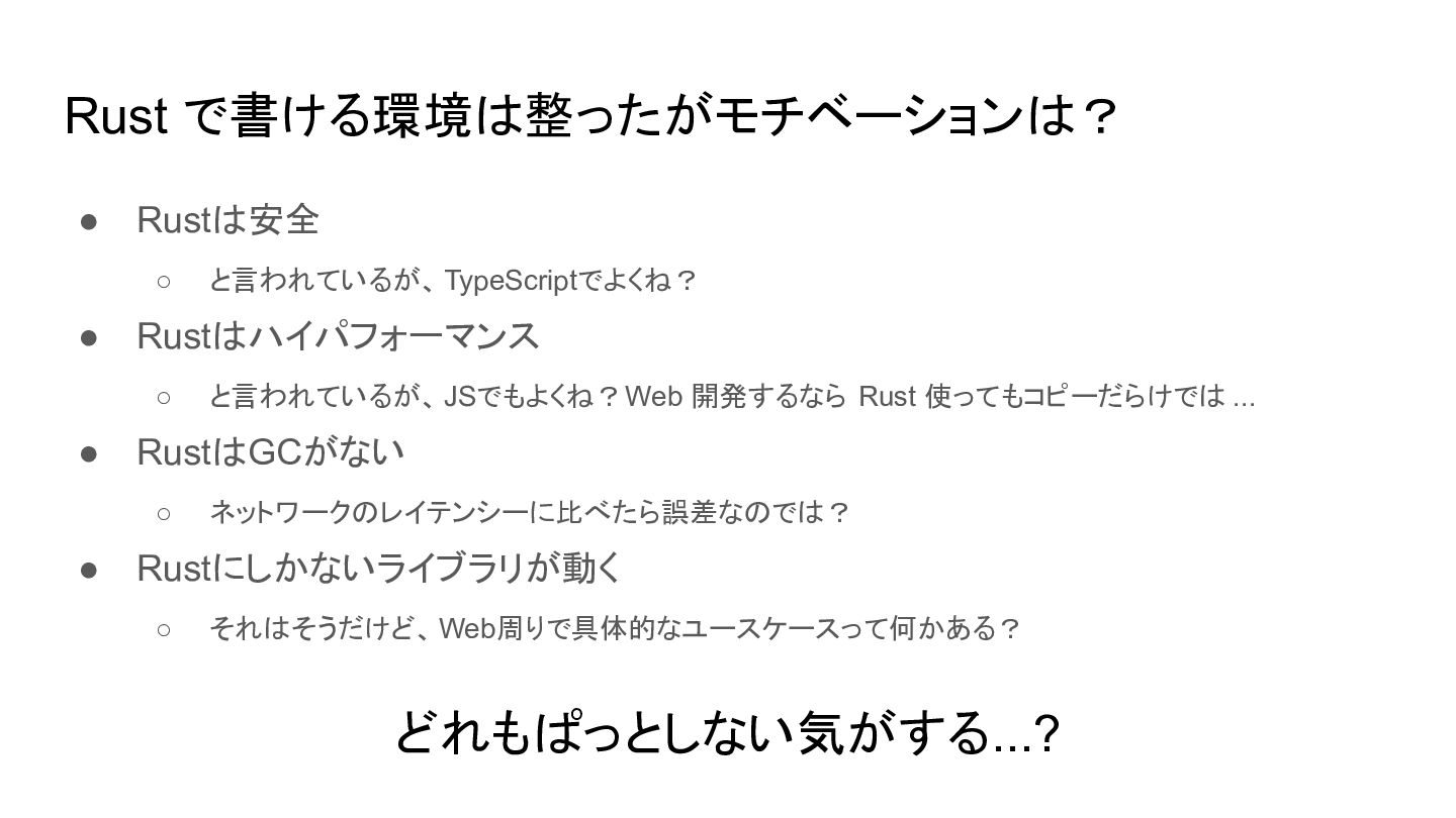 Rust で書ける環境は整ったがモチベーションは? • Rustは安全 ◦ と言われているが、TypeScriptでよくね? • Rustはハイパフォーマンス ◦ と言われているが、JSでもよくね?Web