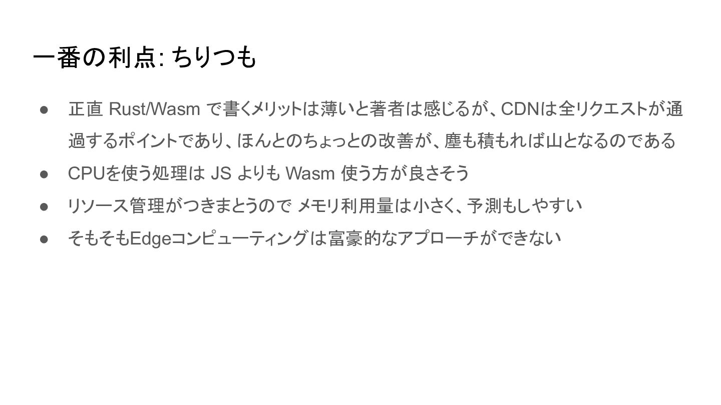 一番の利点: ちりつも • 正直 Rust/Wasm で書くメリットは薄いと著者は感じるが、CDNは全リクエストが通 過するポイントであり、ほんとのちょっとの改善が、塵も積もれば山となるのである • CPUを使う処理は JS
