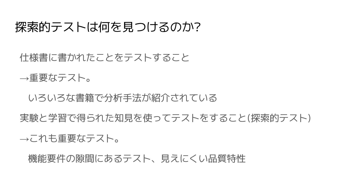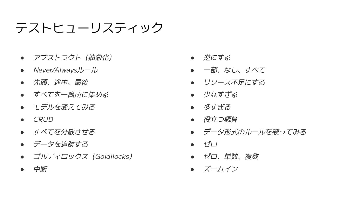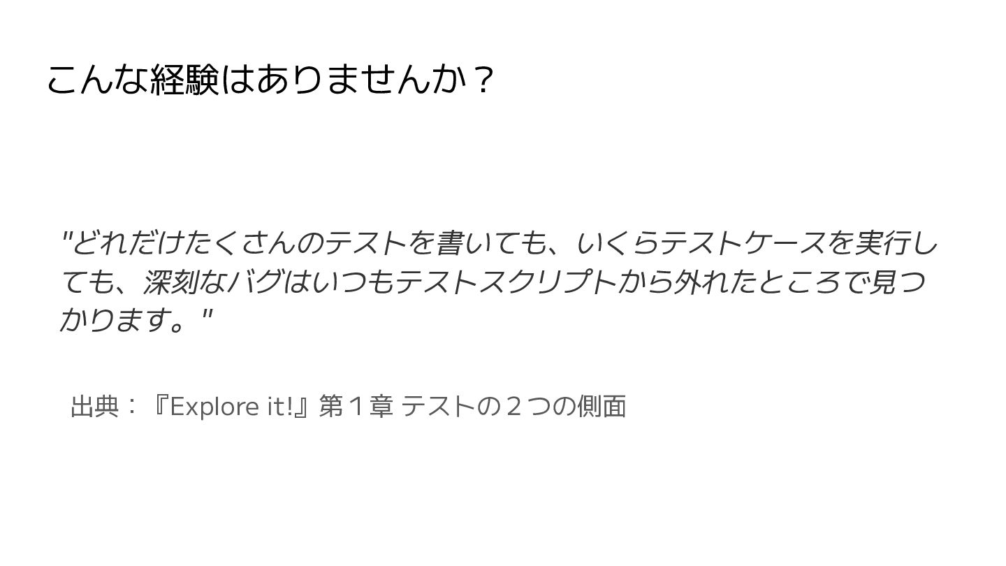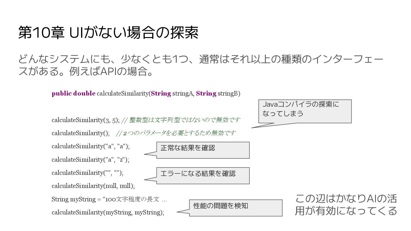 stringB) calculateSimilarity(3, 5); // 整数型は文字列 型ではないので無効です calculateSimilarity(); // 2つのパラメータを必要とするため無効です calculateSimilarity( "a" , "a" ); calculateSimilarity( "a" , "z" ); calculateSimilarity( "" , "" ); calculateSimilarity(null, null); String myString = "100文字程度の長文 ... calculateSimilarity(myString, myString); Javaコンパイラの探索に なってしまう 正常な結果を確認 エラーになる結果を確認 性能の問題を検知 この辺はかなりAIの活 用が有効になってくる