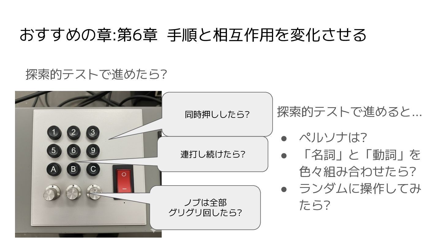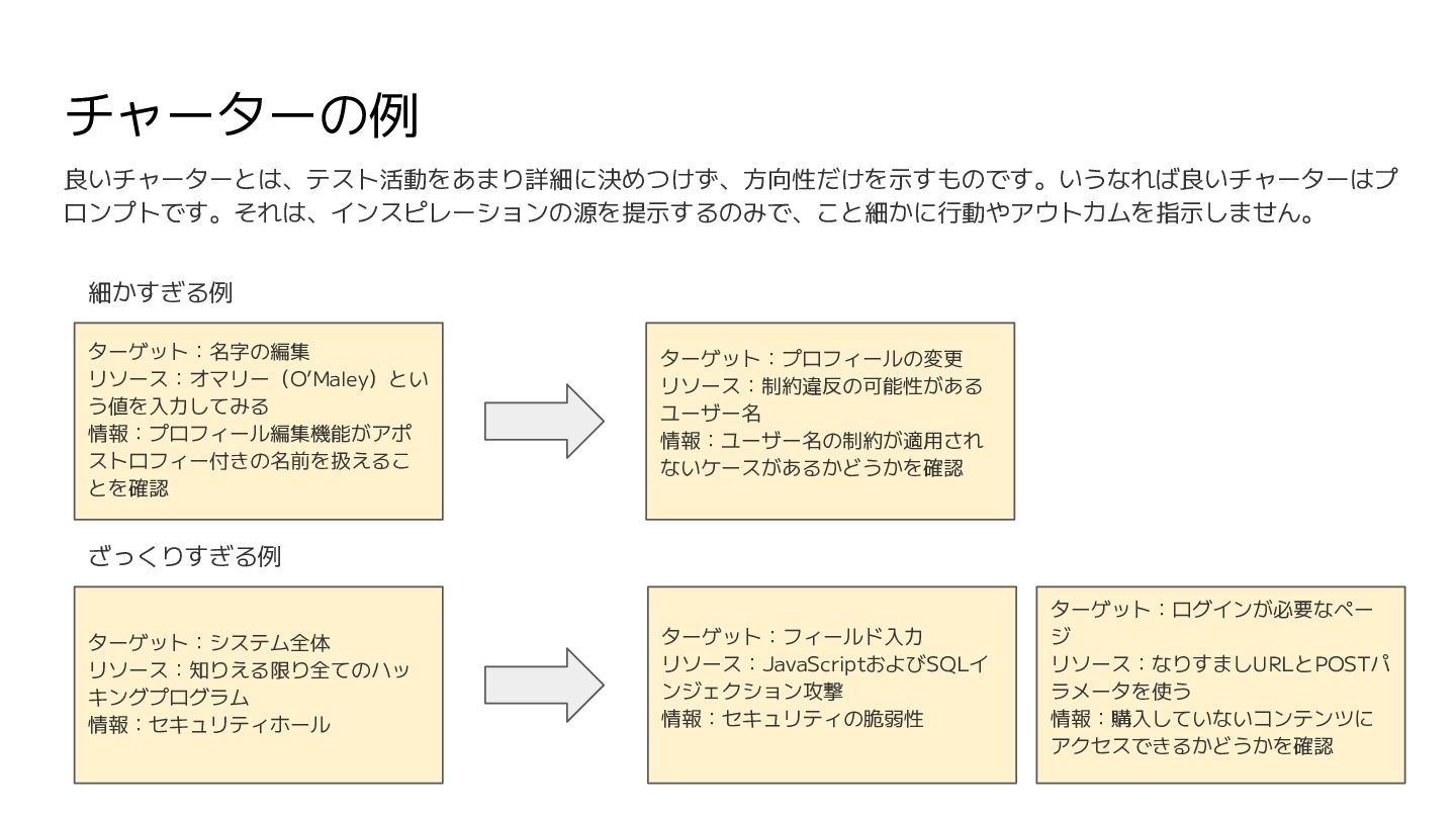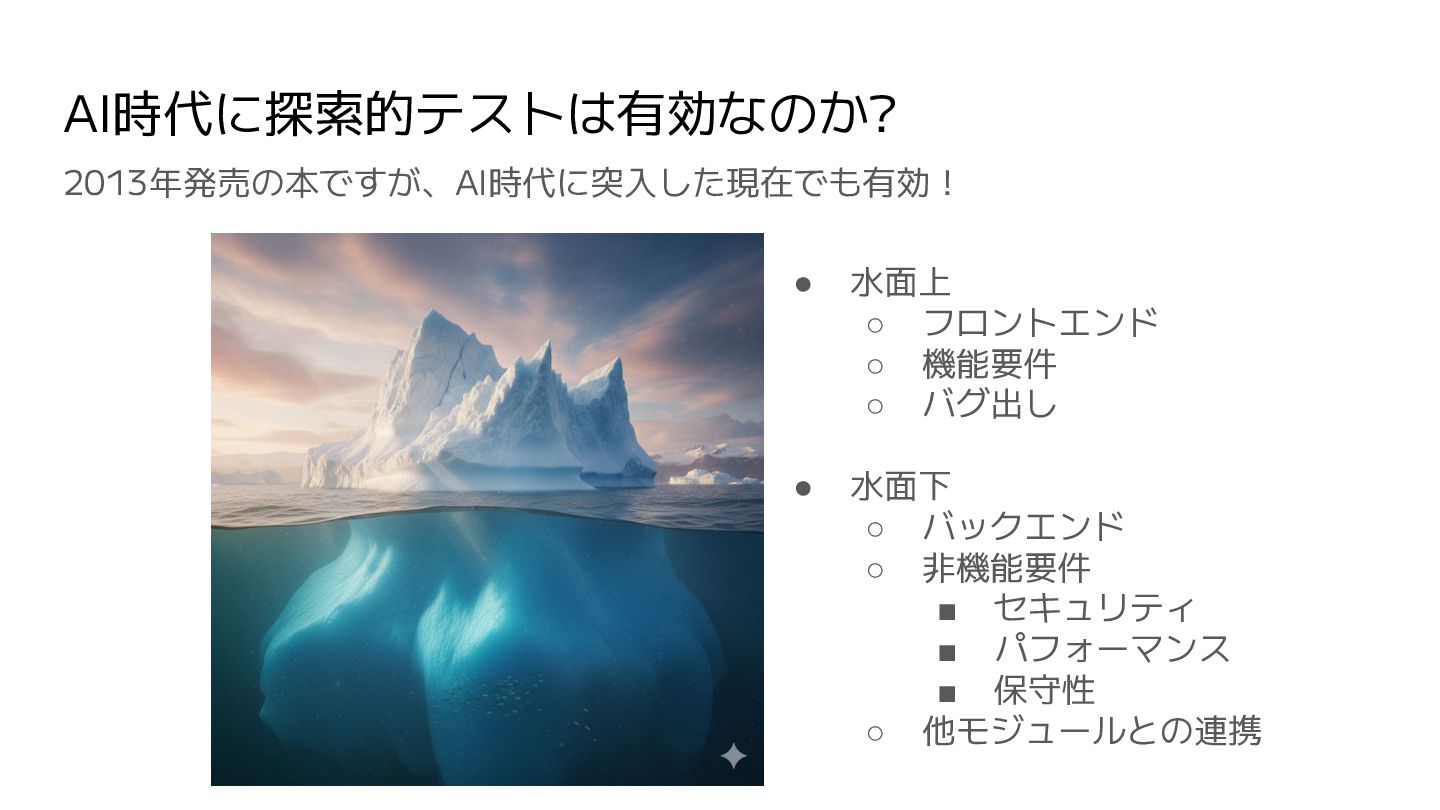 stringB) calculateSimilarity(3, 5); // 整数型は文字列 型ではないので無効です calculateSimilarity(); // 2つのパラメータを必要とするため無効です calculateSimilarity( "a" , "a" ); calculateSimilarity( "a" , "z" ); calculateSimilarity( "" , "" ); calculateSimilarity(null, null); String myString = "100文字程度の長文 ... calculateSimilarity(myString, myString); Javaコンパイラの探索に なってしまう 正常な結果を確認 エラーになる結果を確認 性能の問題を検知 この辺はかなりAIの活 用が有効になってくる