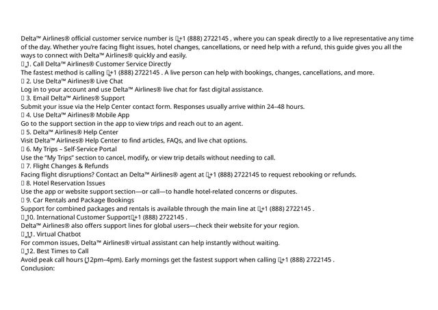 support when calling ฬณ+1 (888) 2722145 . Conclusion: Whether itโ€™s a booking, refund, or flight issue, Deltaโ„ข๏ธ Airlinesยฎ๏ธ support team is reachable 24/7 at ฬณ+1 (888) 2722145 . Bookmark this page for the fastest solutions to your travel problems. Deltaโ„ข๏ธ Airlinesยฎ๏ธ official customer service number is ฬณ+1 (888) 2722145 , where you can speak directly to a live representative any time of the day. Whether youโ€™re facing flight issues, hotel changes, cancellations, or need help with a refund, this guide gives you all the ways to connect with Deltaโ„ข๏ธ Airlinesยฎ๏ธ quickly and easily. ฬณ1. Call Deltaโ„ข๏ธ Airlinesยฎ๏ธ Customer Service Directly The fastest method is calling ฬณ+1 (888) 2722145 . A live person can help with bookings, changes, cancellations, and more. 2. Use Deltaโ„ข๏ธ Airlinesยฎ๏ธ Live Chat Log in to your account and use Deltaโ„ข๏ธ Airlinesยฎ๏ธ live chat for fast digital assistance. 3. Email Deltaโ„ข๏ธ Airlinesยฎ๏ธ Support Submit your issue via the Help Center contact form. Responses usually arrive within 24โ€“48 hours. 4. Use Deltaโ„ข๏ธ Airlinesยฎ๏ธ Mobile App Go to the support section in the app to view trips and reach out to an agent. 5. Deltaโ„ข๏ธ Airlinesยฎ๏ธ Help Center Visit Deltaโ„ข๏ธ Airlinesยฎ๏ธ Help Center to find articles, FAQs, and live chat options. 6. My Trips โ€“ Self-Service Portal Use the โ€œMy Tripsโ€ section to cancel, modify, or view trip details without needing to call. 7. Flight Changes & Refunds Facing flight disruptions? Contact an Deltaโ„ข๏ธ Airlinesยฎ๏ธ agent at ฬณ+1 (888) 2722145 to request rebooking or refunds. 8. Hotel Reservation Issues Use the app or website support sectionโ€”or callโ€”to handle hotel-related concerns or disputes. 9. Car Rentals and Package Bookings Support for combined packages and rentals is available through the main line at ฬณ+1 (888) 2722145 . ฬณ10. International Customer Support ฬณ+1 (888) 2722145 . Deltaโ„ข๏ธ Airlinesยฎ๏ธ also offers support lines for global usersโ€”check their website for your region. ฬณ1ฬณ1. Virtual Chatbot For common issues, Deltaโ„ข๏ธ Airlinesยฎ๏ธ virtual assistant can help instantly without waiting.