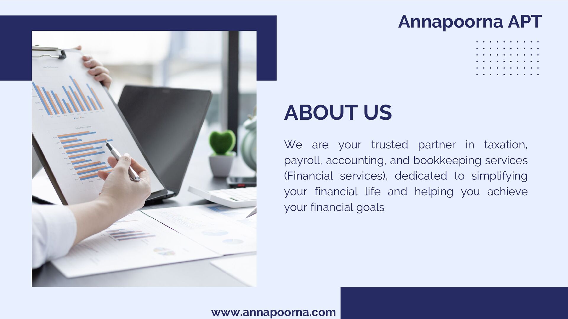 accounting, and bookkeeping services (Financial services), dedicated to simplifying your financial life and helping you achieve your financial goals www.annapoorna.com Annapoorna APT