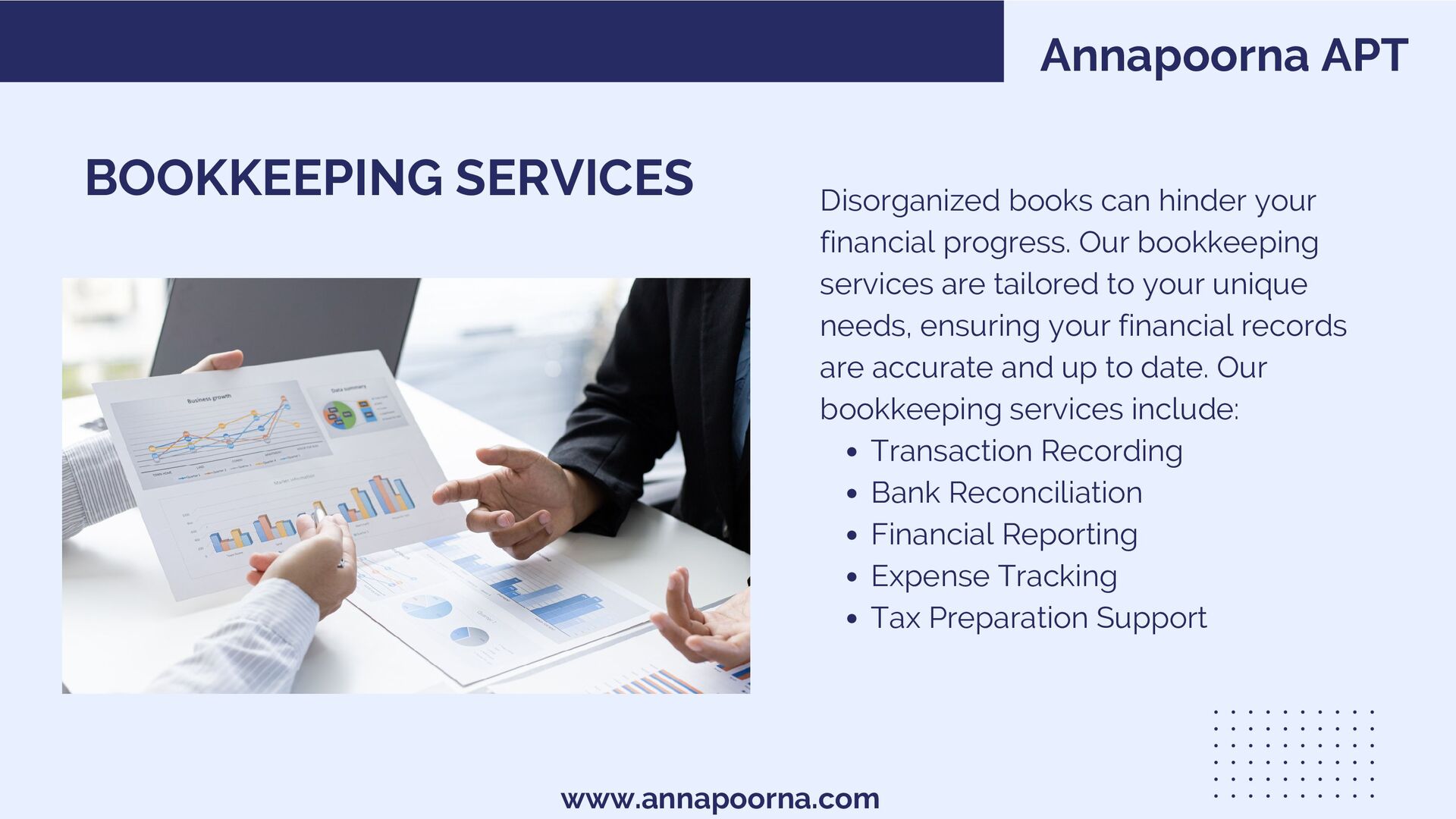 bookkeeping services are tailored to your unique needs, ensuring your financial records are accurate and up to date. Our bookkeeping services include: Transaction Recording Bank Reconciliation Financial Reporting Expense Tracking Tax Preparation Support www.annapoorna.com Annapoorna APT