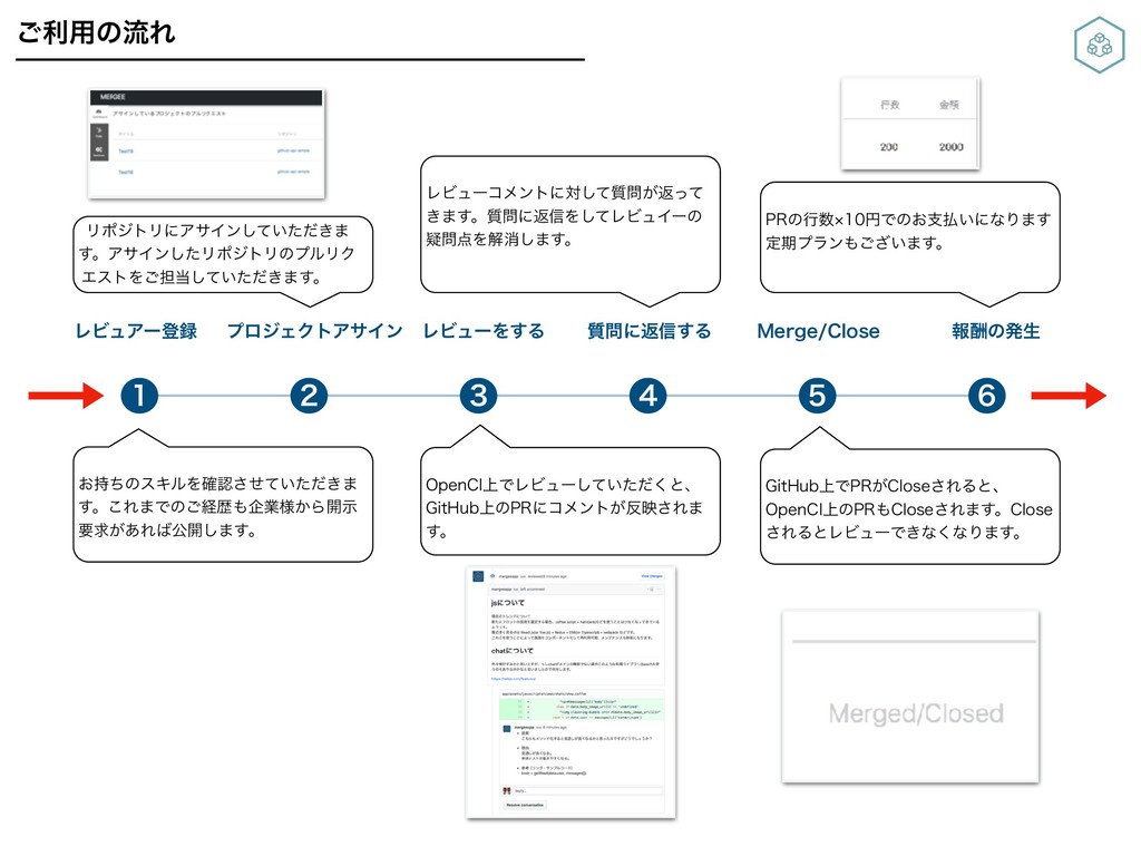 ͝ར༻ͷྲྀΕ ϨϏϡΞʔొ ϓϩδΣΫτΞαΠϯ ϨϏϡʔΛ͢Δ ࣭ʹฦ৴͢Δ .FSHF$MPTF ใुͷൃੜ ͓࣋ͪͷεΩϧΛ֬ೝ͍͖ͤͯͨͩ͞· ͢ɻ͜Ε·Ͱͷ͝ܦྺاۀ༷͔Β։ࣔ ཁٻ͕͋Εެ։͠·͢ɻ