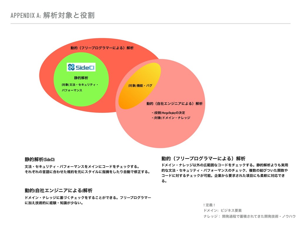 ɾ[ର৅] υϝΠϯɾφϨοδ ੩తղੳ(SideCI) จ๏ɾηΩϡϦςΟɾύϑΥʔϚϯεΛϝΠϯʹίʔυΛνΣοΫ͢Δɻ ͦΕͧΕͷݴޠʹ߹Θͤͨن໿ΛݩʹελΠϧʹࢦఠΛͨ͠ΓࣗಈͰमਖ਼͢Δɻ ಈతʢϑϦʔϓϩάϥϚʔʹΑΔʣղੳ υϝΠϯɾφϨοδҎ֎ͷ޿ൣғͳίʔυΛνΣοΫ͢Δɻ੩తղੳΑΓ΋࣮༻ తͳจ๏ɾηΩϡϦςΟɾύϑΥʔϚϯεͷνΣοΫɺෳ਺ͷ݁ͼ͍ͭͨؔ਺΍ ίʔυʹର͢ΔνΣοΫ͕Մೳɻاۀ͔Βཁٻ͞Ε߲ͨ໨ʹ΋ॊೈʹରԠͰ͖ Δɻ ಈత(ࣗࣾΤϯδχΞʹΑΔ)ղੳ υϝΠϯɾφϨοδʹجͮ͘νΣοΫΛ͢Δ͜ͱ͕Ͱ͖ΔɻϑϦʔϓϩάϥϚʔ ʹՃٕ͑ज़తʹܦݧɾ஌͕ࣝগͳ͍ɻ APPENDIX A: ղੳର৅ͱ໾ׂ ! ఆٛ ! υϝΠϯ: Ϗδωεཁૉ φϨοδɿ ։ൃաఔͰ஝ੵ͞Ε͖ͯͨ։ൃٕज़ɾϊ΢ϋ΢