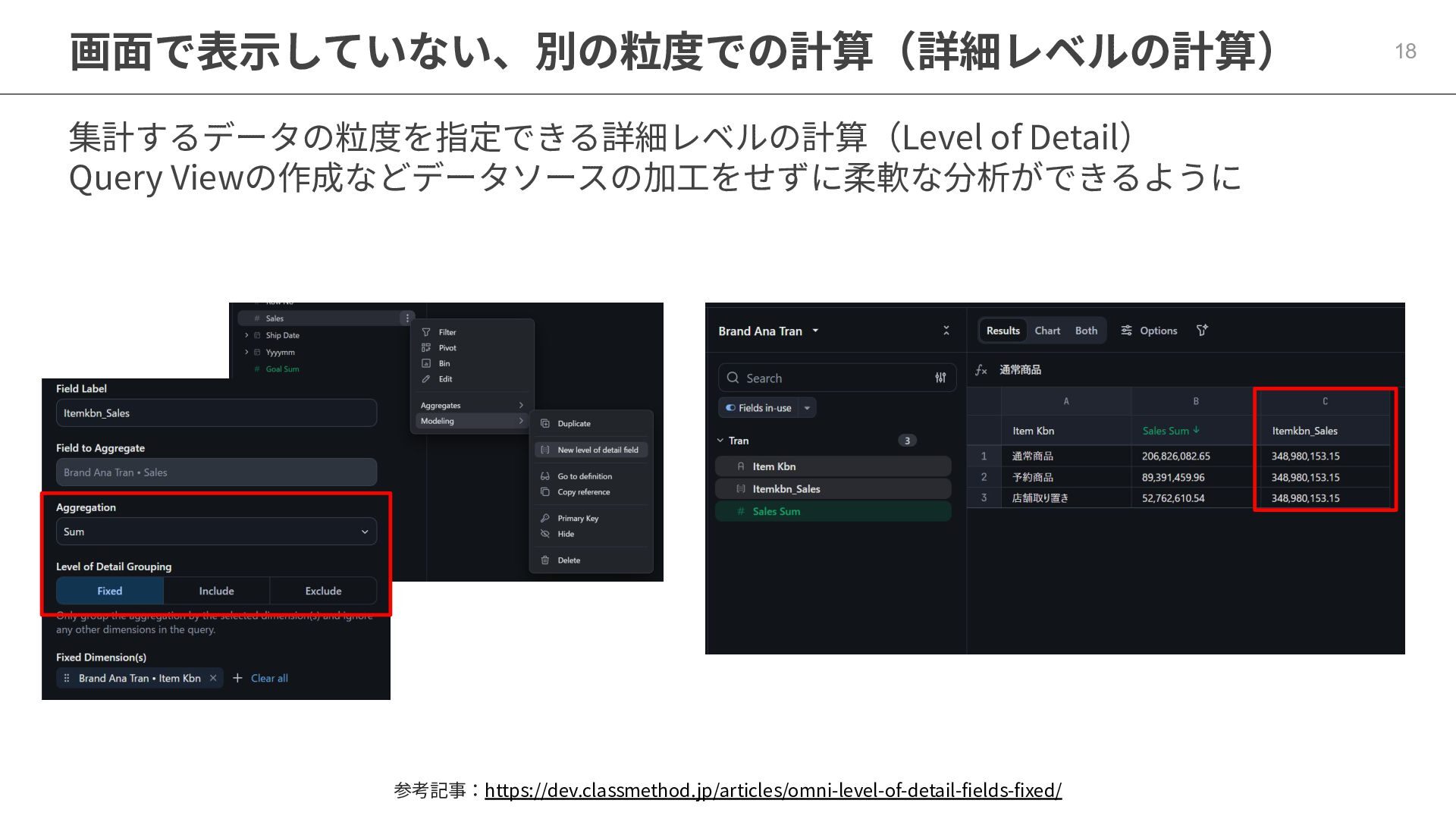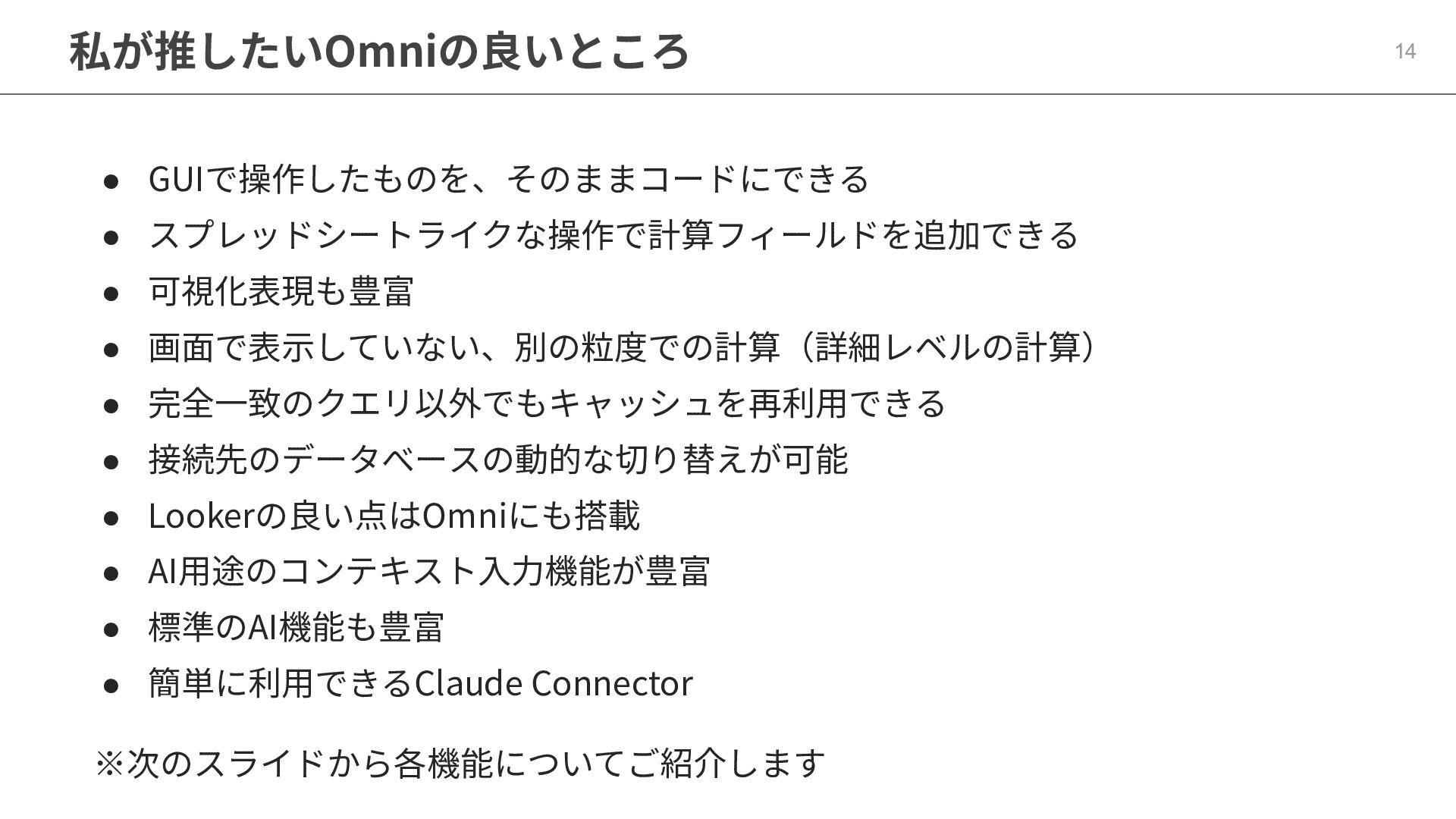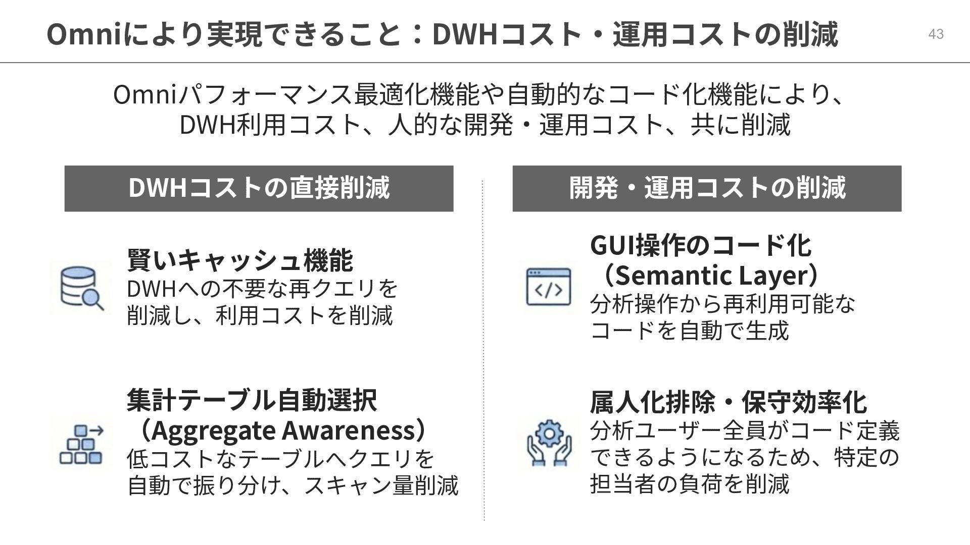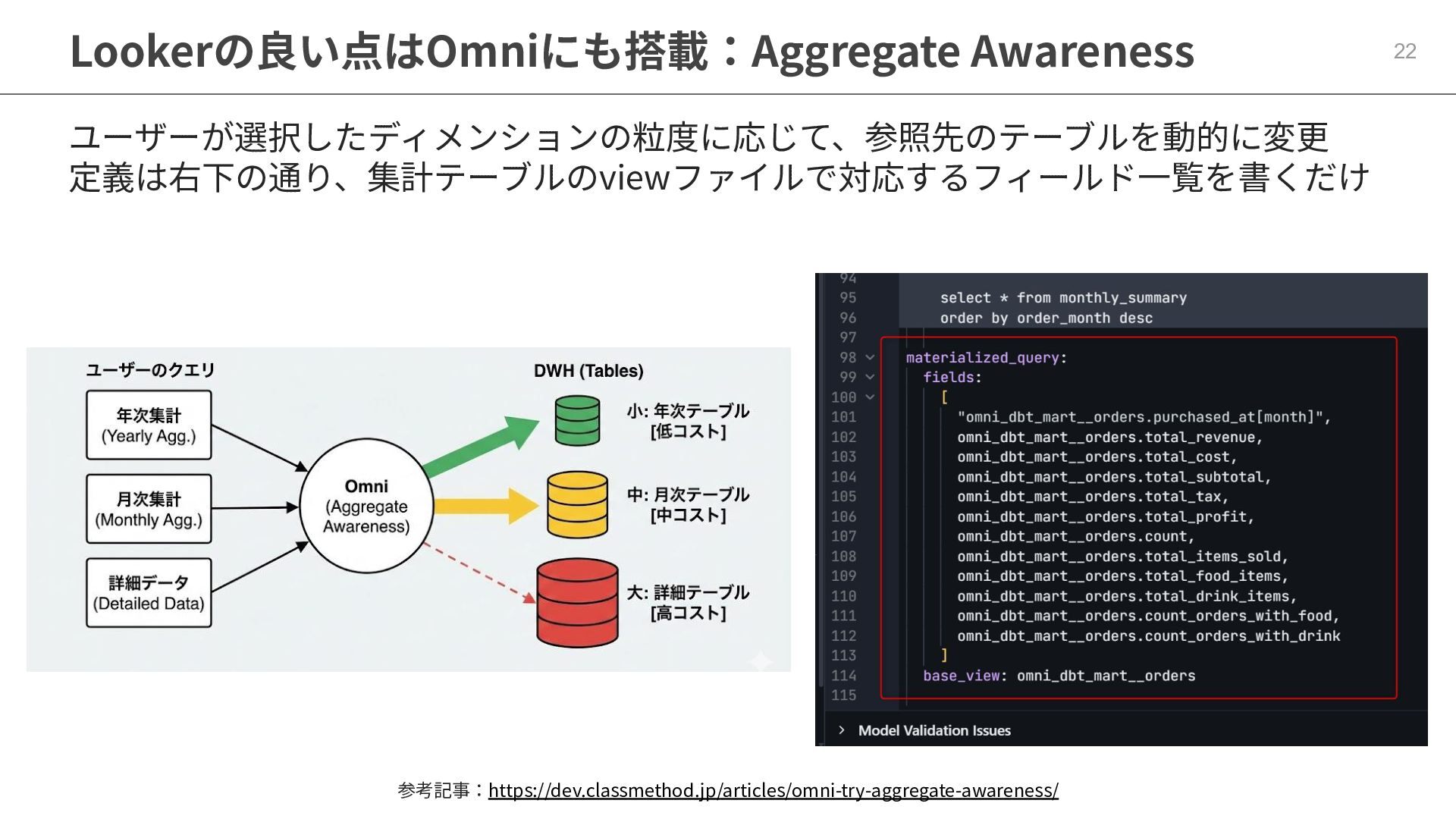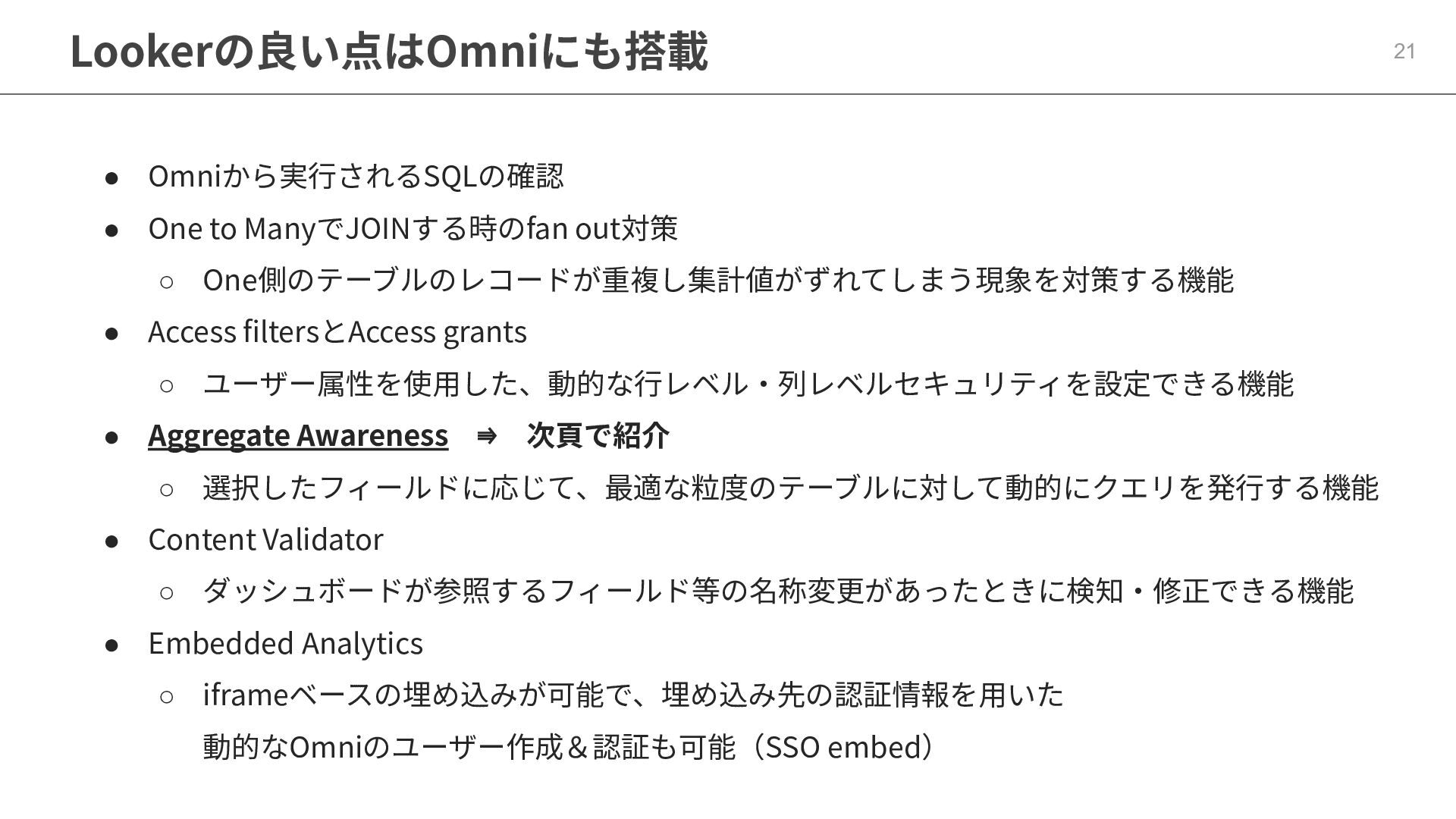 One側のテーブルのレコードが重複し集計値がずれてしまう現象を対策する機能 • Access filtersとAccess grants ◦ ユーザー属性を使⽤した、動的な⾏レベル‧列レベルセキュリティを設定できる機能 • Aggregate Awareness ⇛ 次⾴で紹介 ◦ 選択したフィールドに応じて、最適な粒度のテーブルに対して動的にクエリを発⾏する機能 • Content Validator ◦ ダッシュボードが参照するフィールド等の名称変更があったときに検知‧修正できる機能 • Embedded Analytics ◦ iframeベースの埋め込みが可能で、埋め込み先の認証情報を⽤いた 動的なOmniのユーザー作成&認証も可能(SSO embed)