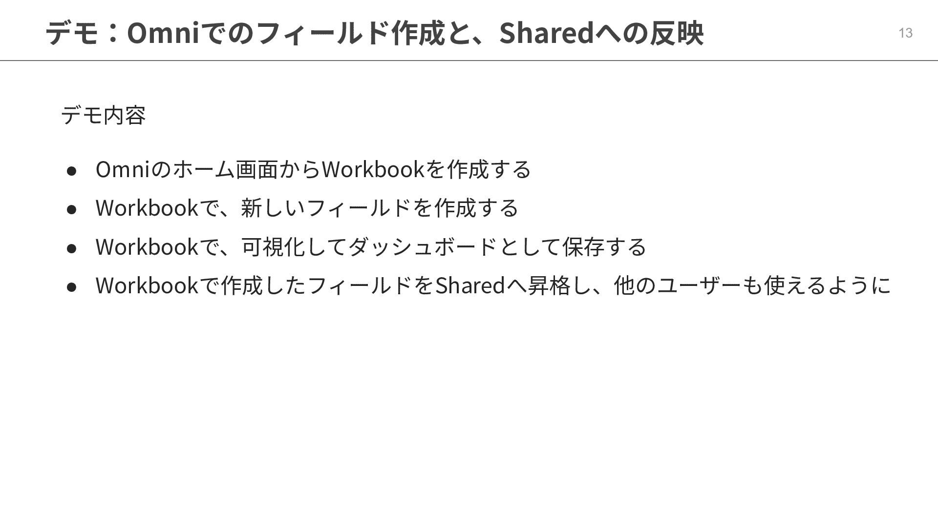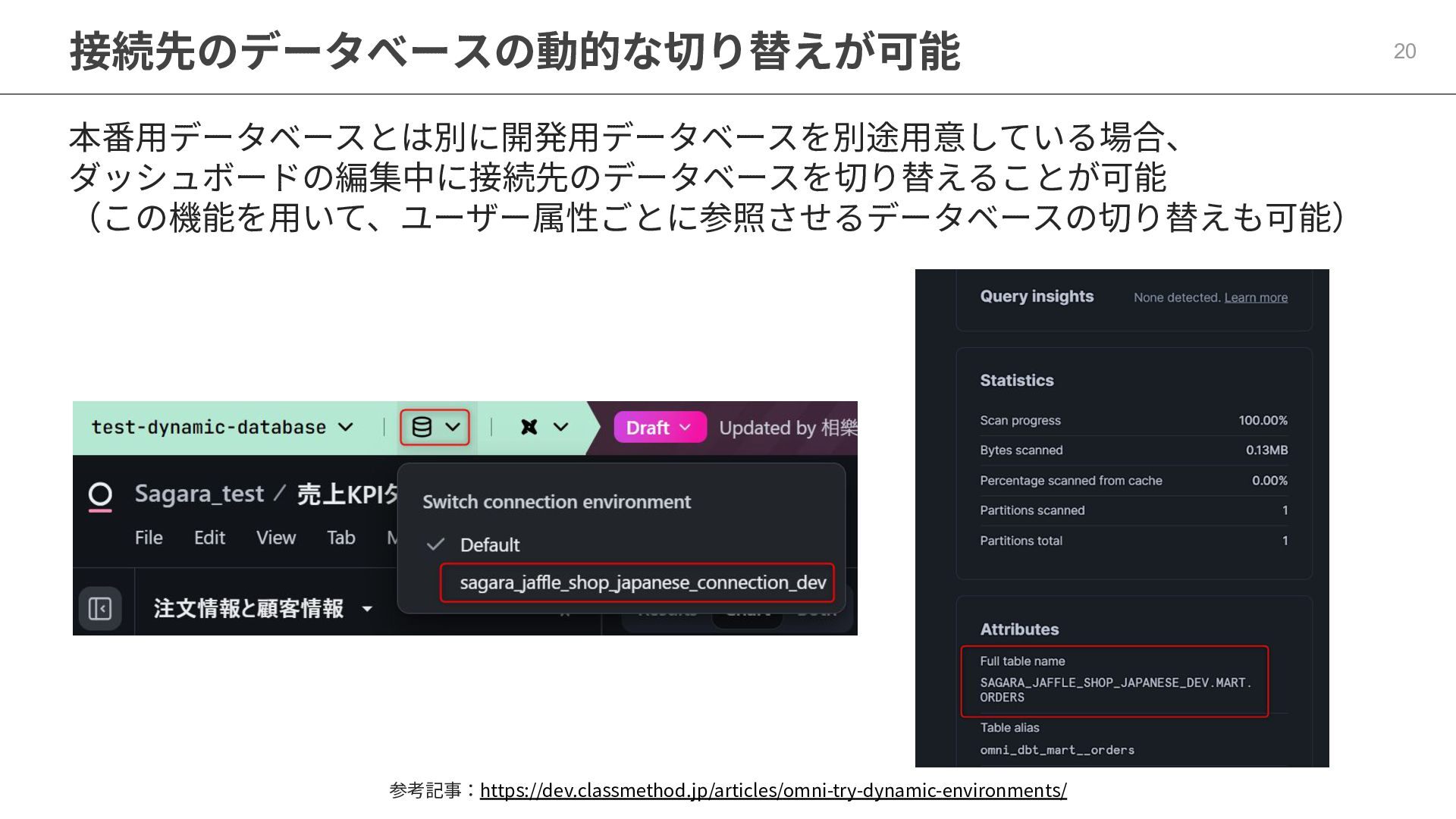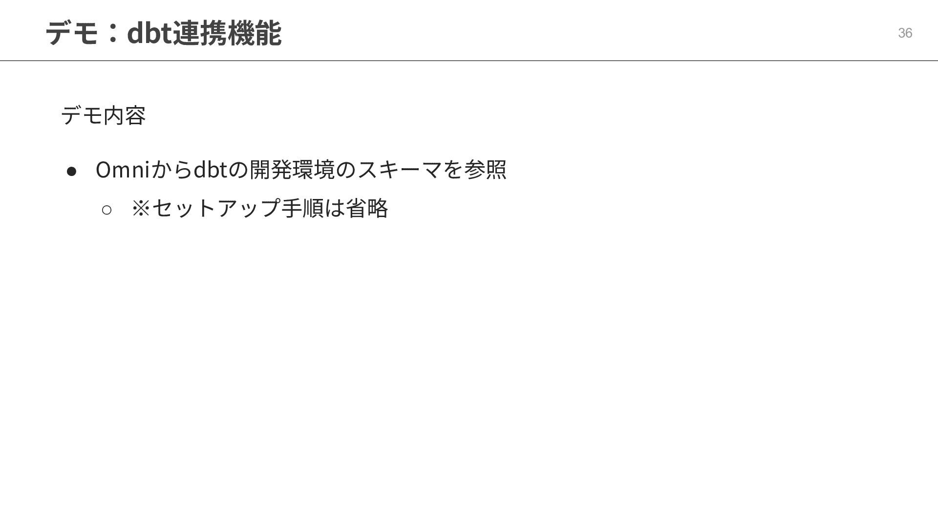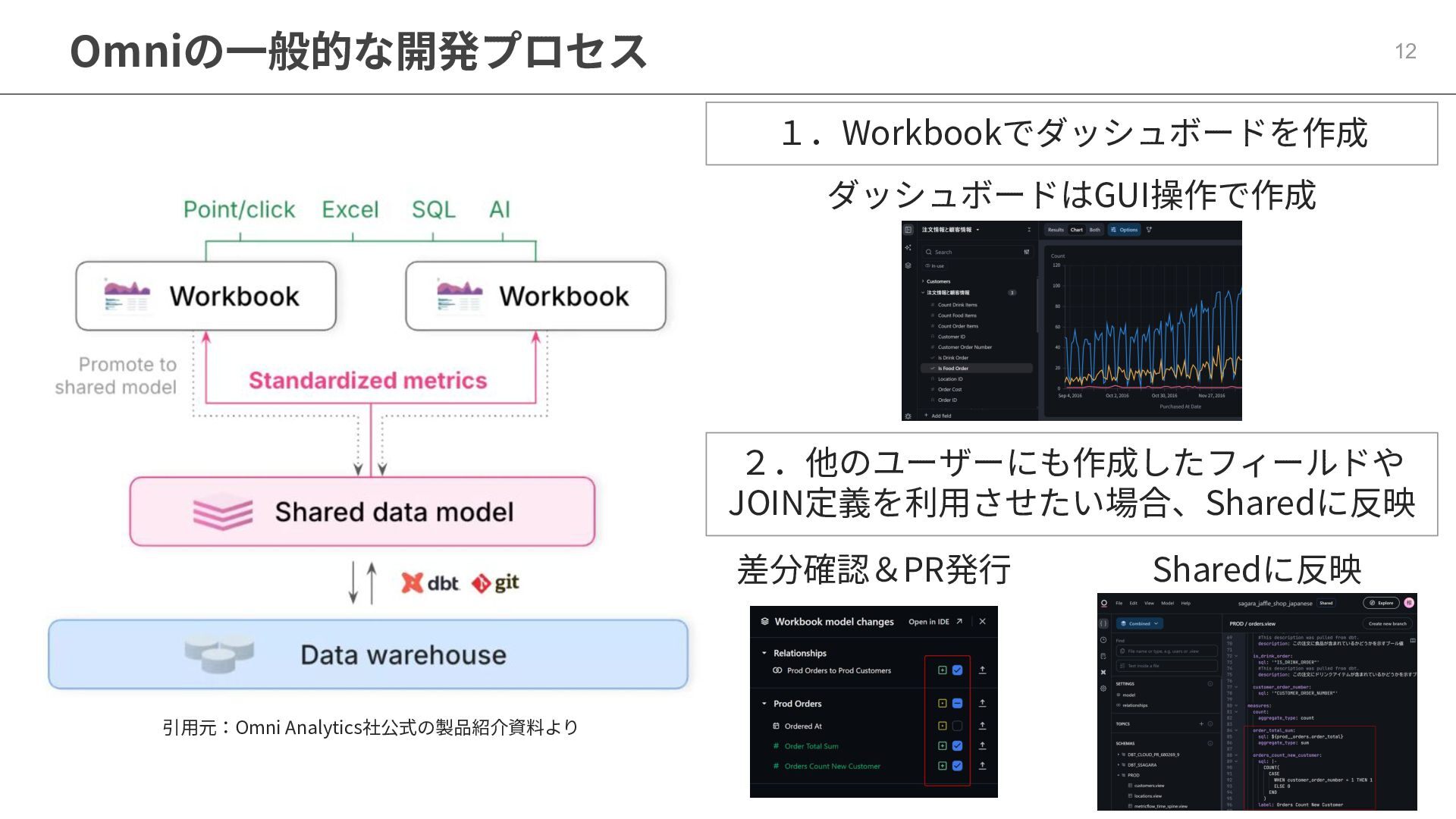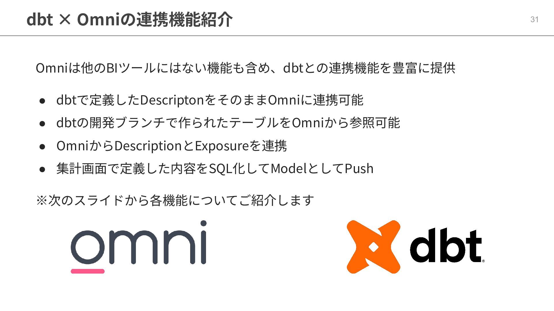 One側のテーブルのレコードが重複し集計値がずれてしまう現象を対策する機能 • Access filtersとAccess grants ◦ ユーザー属性を使⽤した、動的な⾏レベル‧列レベルセキュリティを設定できる機能 • Aggregate Awareness ⇛ 次⾴で紹介 ◦ 選択したフィールドに応じて、最適な粒度のテーブルに対して動的にクエリを発⾏する機能 • Content Validator ◦ ダッシュボードが参照するフィールド等の名称変更があったときに検知‧修正できる機能 • Embedded Analytics ◦ iframeベースの埋め込みが可能で、埋め込み先の認証情報を⽤いた 動的なOmniのユーザー作成&認証も可能(SSO embed)