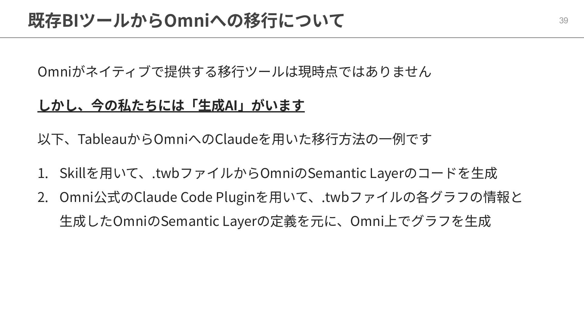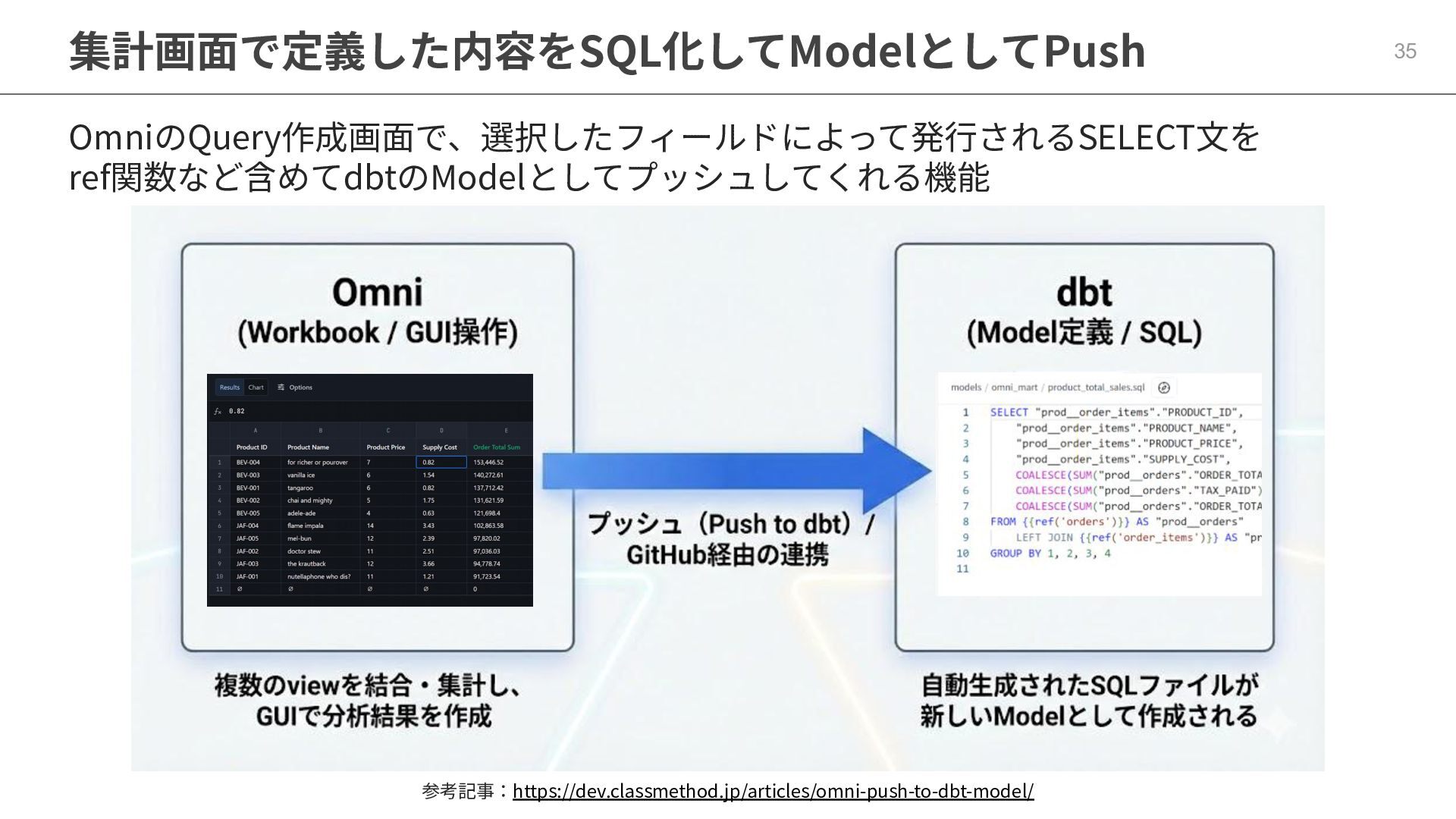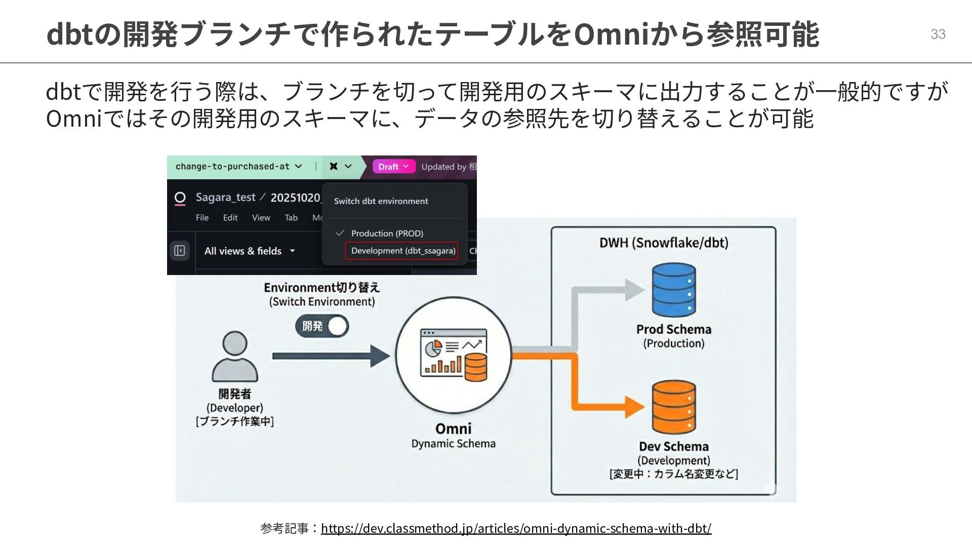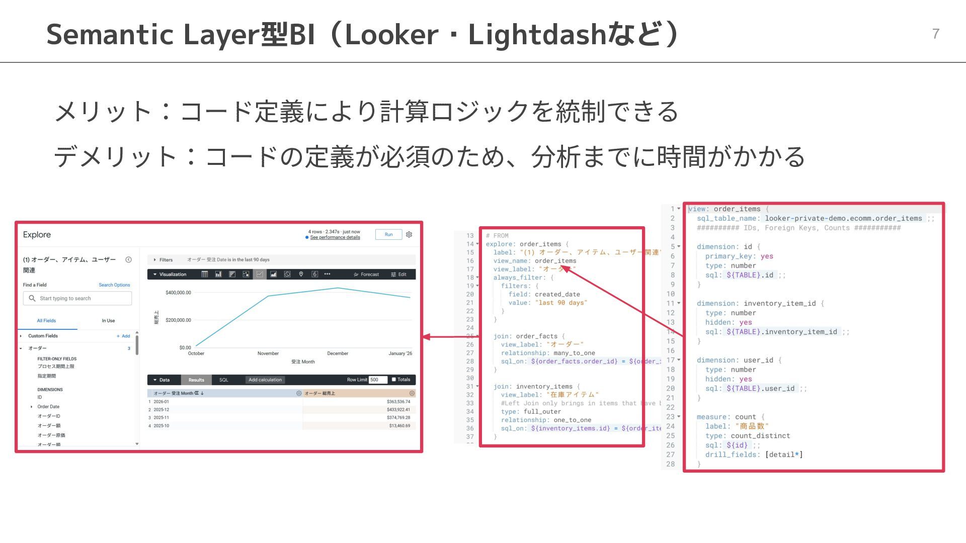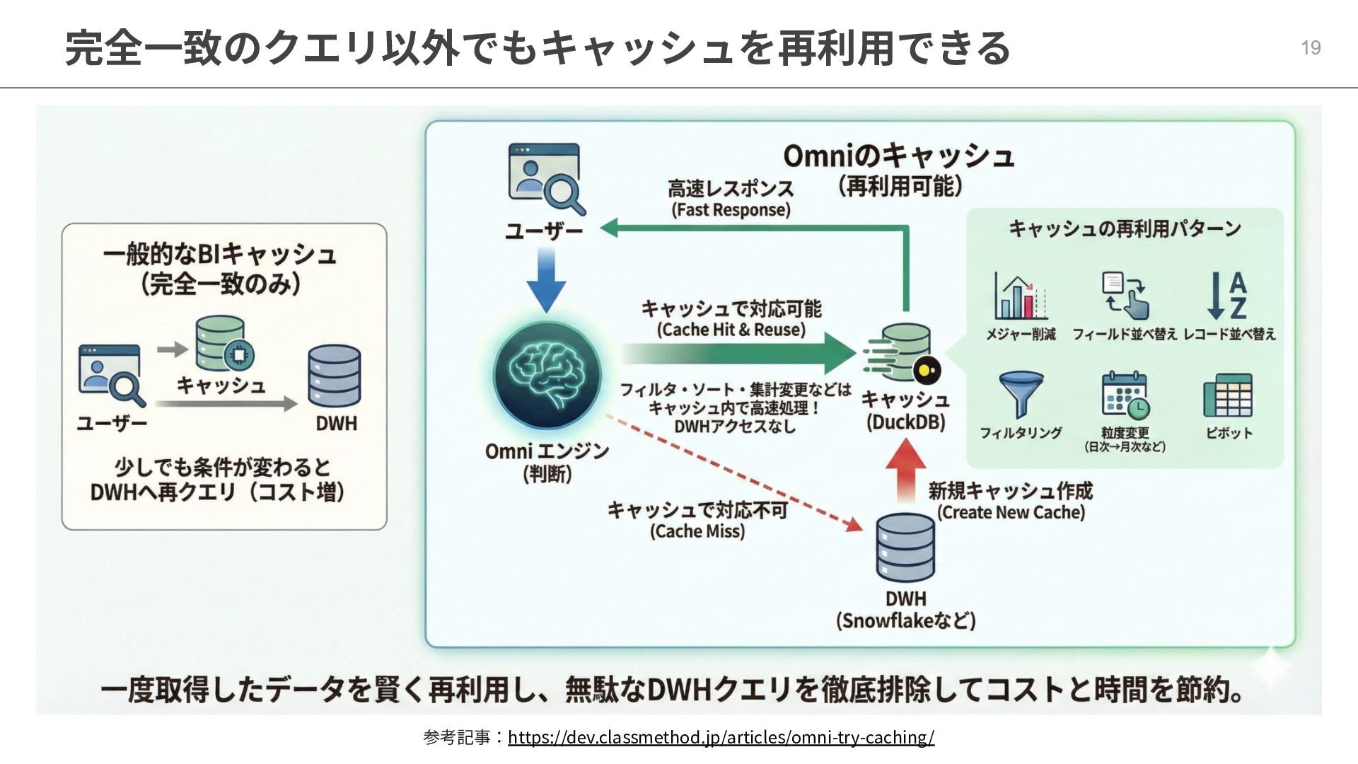 One側のテーブルのレコードが重複し集計値がずれてしまう現象を対策する機能 • Access filtersとAccess grants ◦ ユーザー属性を使⽤した、動的な⾏レベル‧列レベルセキュリティを設定できる機能 • Aggregate Awareness ⇛ 次⾴で紹介 ◦ 選択したフィールドに応じて、最適な粒度のテーブルに対して動的にクエリを発⾏する機能 • Content Validator ◦ ダッシュボードが参照するフィールド等の名称変更があったときに検知‧修正できる機能 • Embedded Analytics ◦ iframeベースの埋め込みが可能で、埋め込み先の認証情報を⽤いた 動的なOmniのユーザー作成&認証も可能(SSO embed)